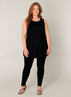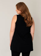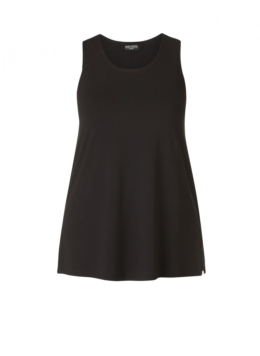 Deze mouwloze zwarte top van Base level curvy is ontworpen als een comfortabele basis. De top heeft een ronde halslijn en een licht uitlopende A-lijn pasvorm. Deze lange basistop valt ruim over de heupen en is aan de onderzijde voorzien van korte zijsplitten. De casual top is een veelzijdig kledingstuk dat je makkelijk in je dagelijkse outfits integreert.