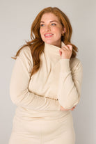Deze Base level curvy coltrui in beige is een fijngebreide trui met lange mouwen. De gebreide trui heeft een opstaande colkraag en een rechte pasvorm die over de heupen valt. De lange trui is uitgevoerd met een effen dessin. De manchetten en de onderzijde van het kledingstuk zijn afgewerkt met een ribboord. Deze comfortabele trui combineer je eenvoudig voor een nuchtere, casual look.