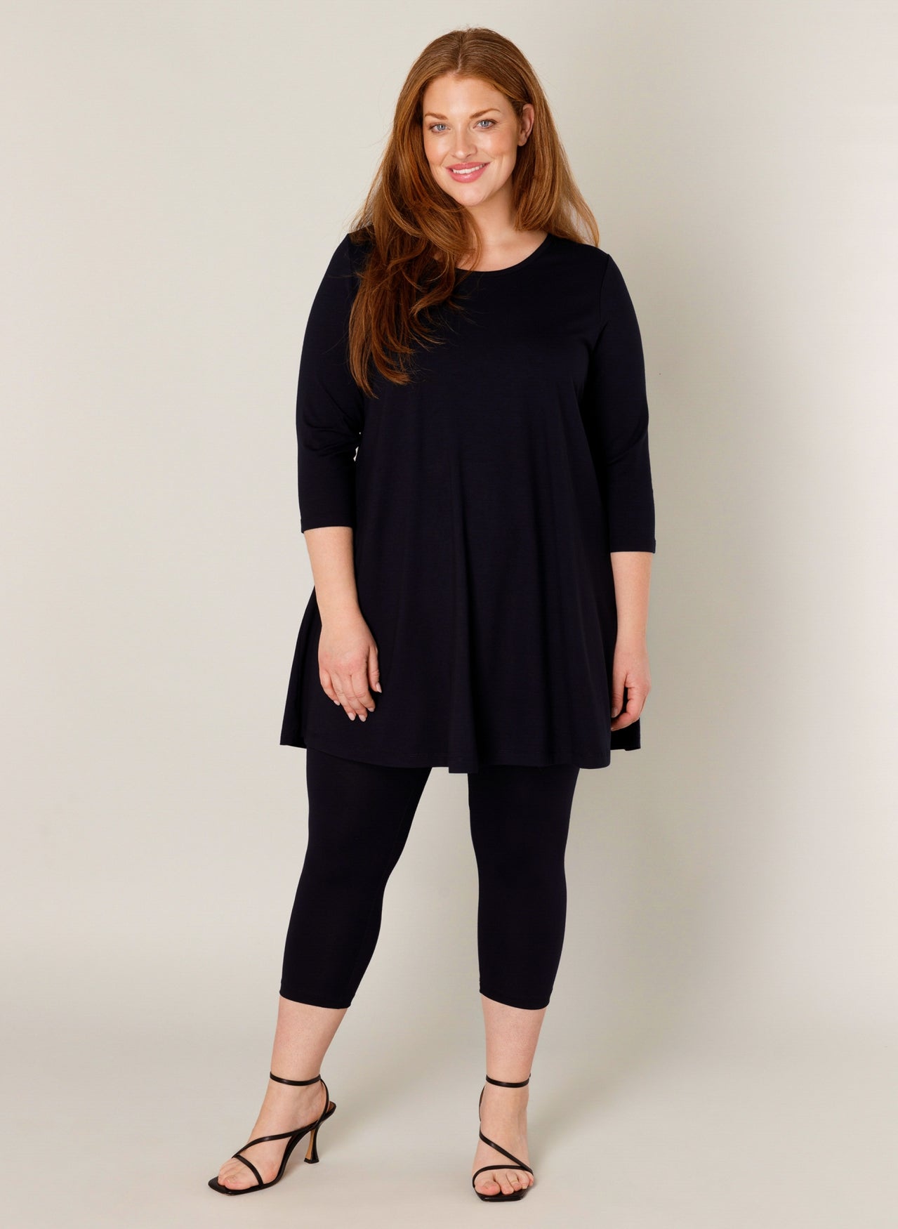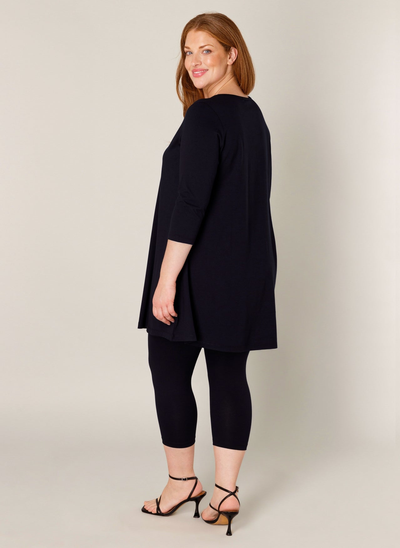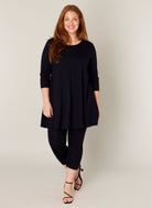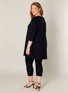 Deze Base level curvy tuniek in donkerblauw heeft een losvallend A-lijn silhouet. De ruime pasvorm valt over de heupen, wat deze lange tuniek een comfortabel kledingstuk maakt. Het item is voorzien van driekwart mouwen en een ronde halslijn. Dit effen dames tuniek model 7000029 van Base level curvy is een neutrale basis voor je garderobe.