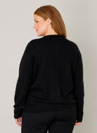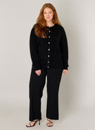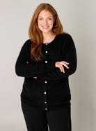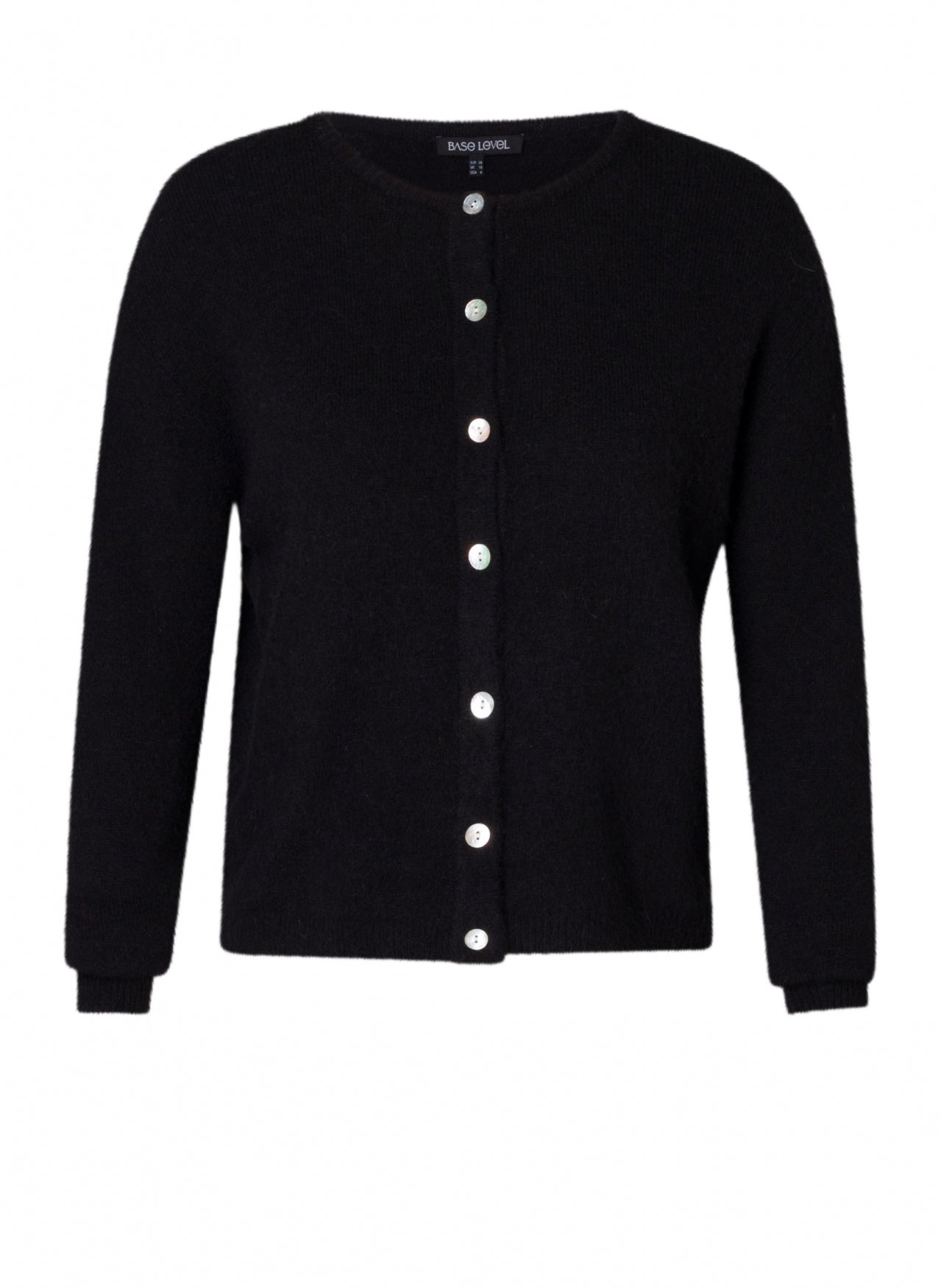 Dit zwarte gebreide Base level curvy vest 7000122 is een casual toevoeging aan je garderobe. Het kledingstuk is uitgevoerd met lange mouwen en een ronde halslijn. Dit zwarte vest sluit aan de voorzijde met een verticale rij parelmoerachtige knopen. Het Base level curvy kledingstuk heeft een reguliere lengte en een licht opgeruwde textuur.