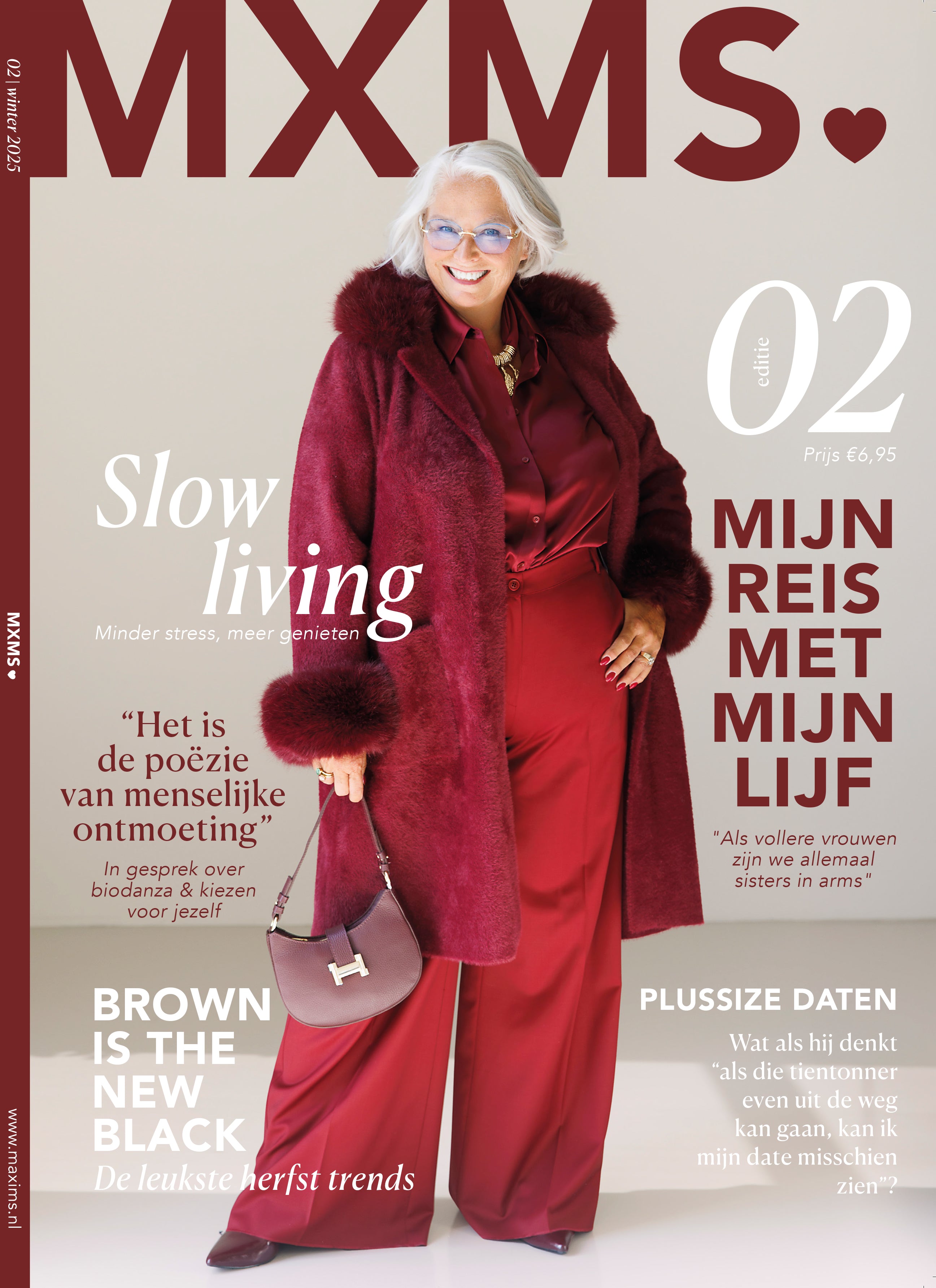 Dit Diversen MXMS Magazine 2 Print is de tweede uitgave van deze periodieke publicatie. Op de omslag in een diepe bordeaux kleur staan diverse artikeltitels vermeld, waaronder 'Slow living' en de rubriek 'PlusSize Daten'. Het gedrukte exemplaar toont op de cover de prijs van €6,95 en het jaartal 2024/2025. Dit tijdschrift is een leesbaar item voor momenten van ontspanning.