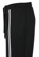 De Doris Streich Broek 872 115 Zwart/Wit is een comfortabele damesbroek met een sportieve uitstraling. Deze casual broek heeft een effen zwarte basis en wordt gekenmerkt door twee witte verticale strepen langs de zijkanten van de broekspijpen. De sportieve pantalon is afgewerkt met een elastische tailleband en een zichtbaar trekkoord. Je bergt je spullen makkelijk op in de steekzakken aan de zijkant. Deze moderne joggingbroek van Doris Streich is ideaal voor een relaxte dag en biedt een nuchtere, toegankelijke stijl.Pasvorm en Stijladvies