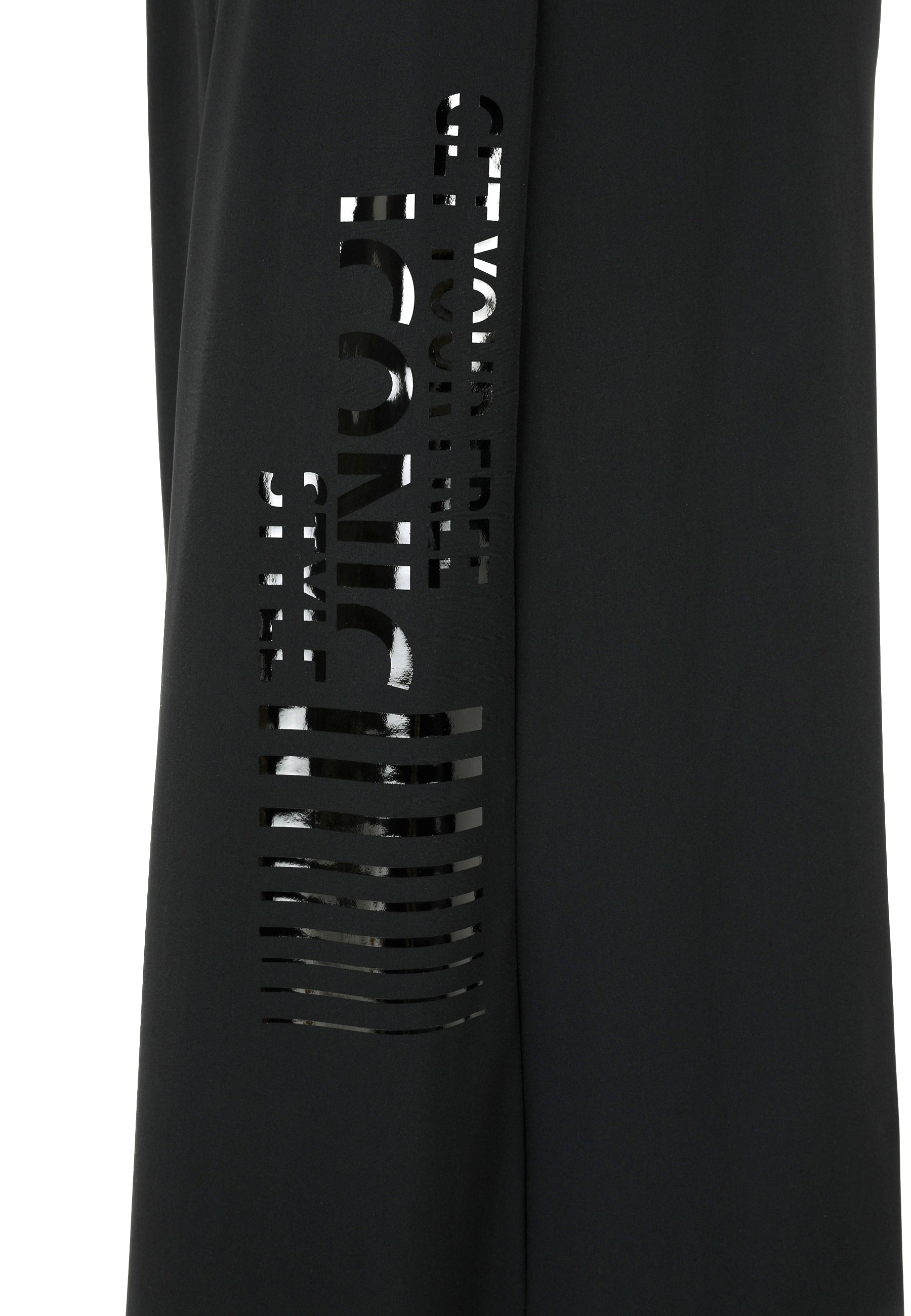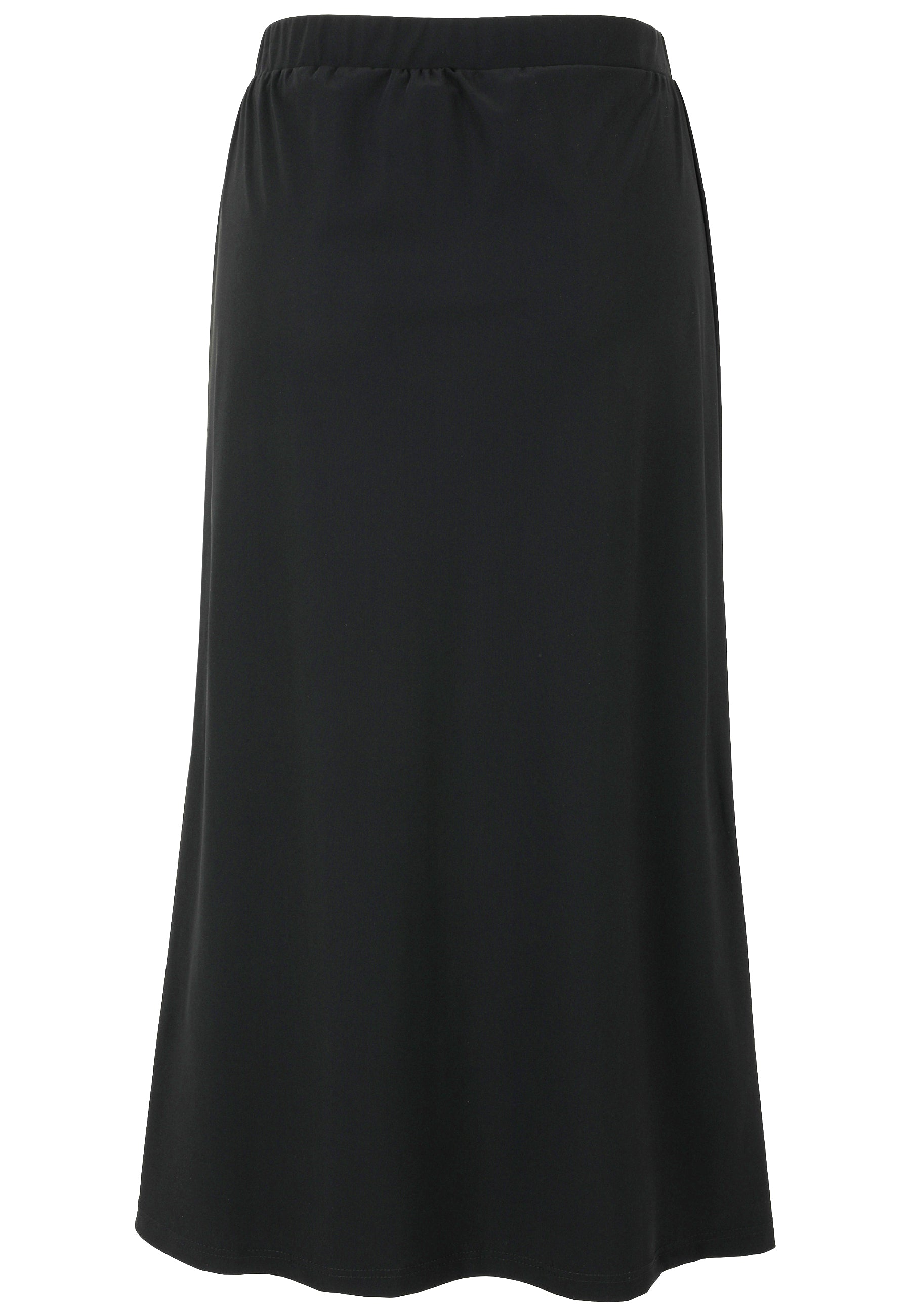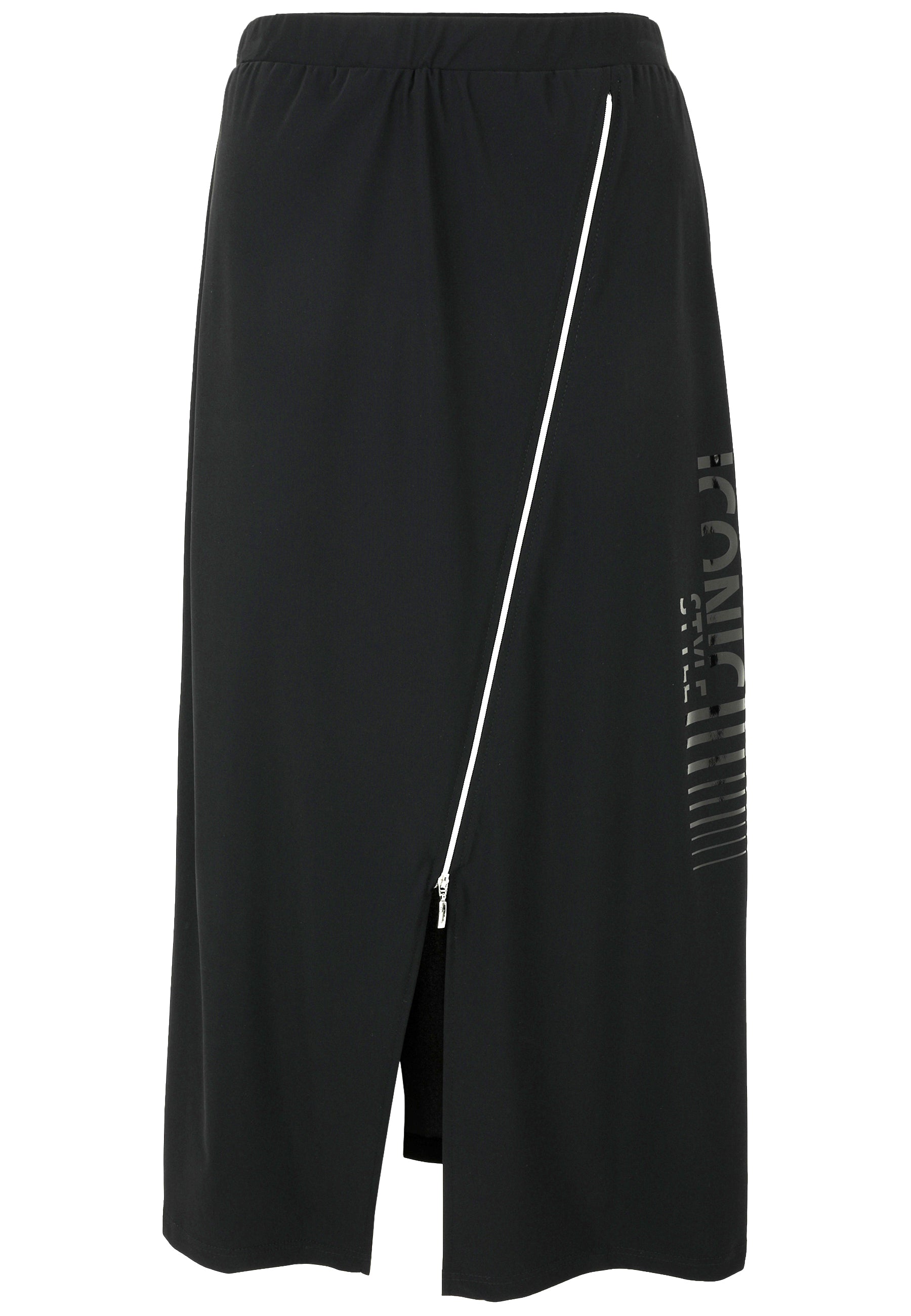 De zwarte midi rok van Doris Streich valt tot over de knie. Het ontwerp heeft een opvallende diagonale witte ritssluiting aan de voorzijde, die doorloopt in een split. Op het rechter voorpand is een glanzende zwarte print zichtbaar met het woord ‘ICONIC’. De rok is voorzien van een elastische tailleband.