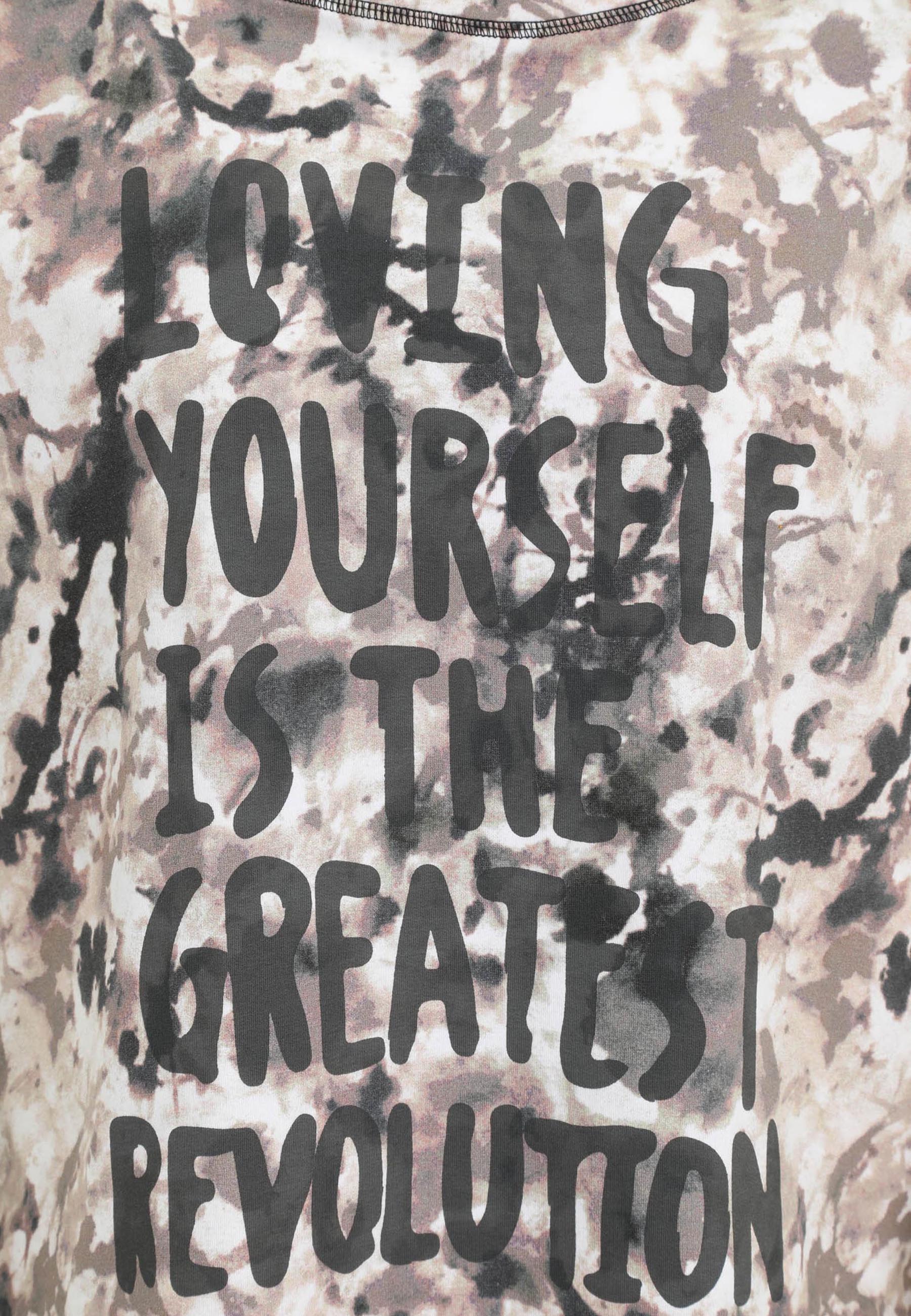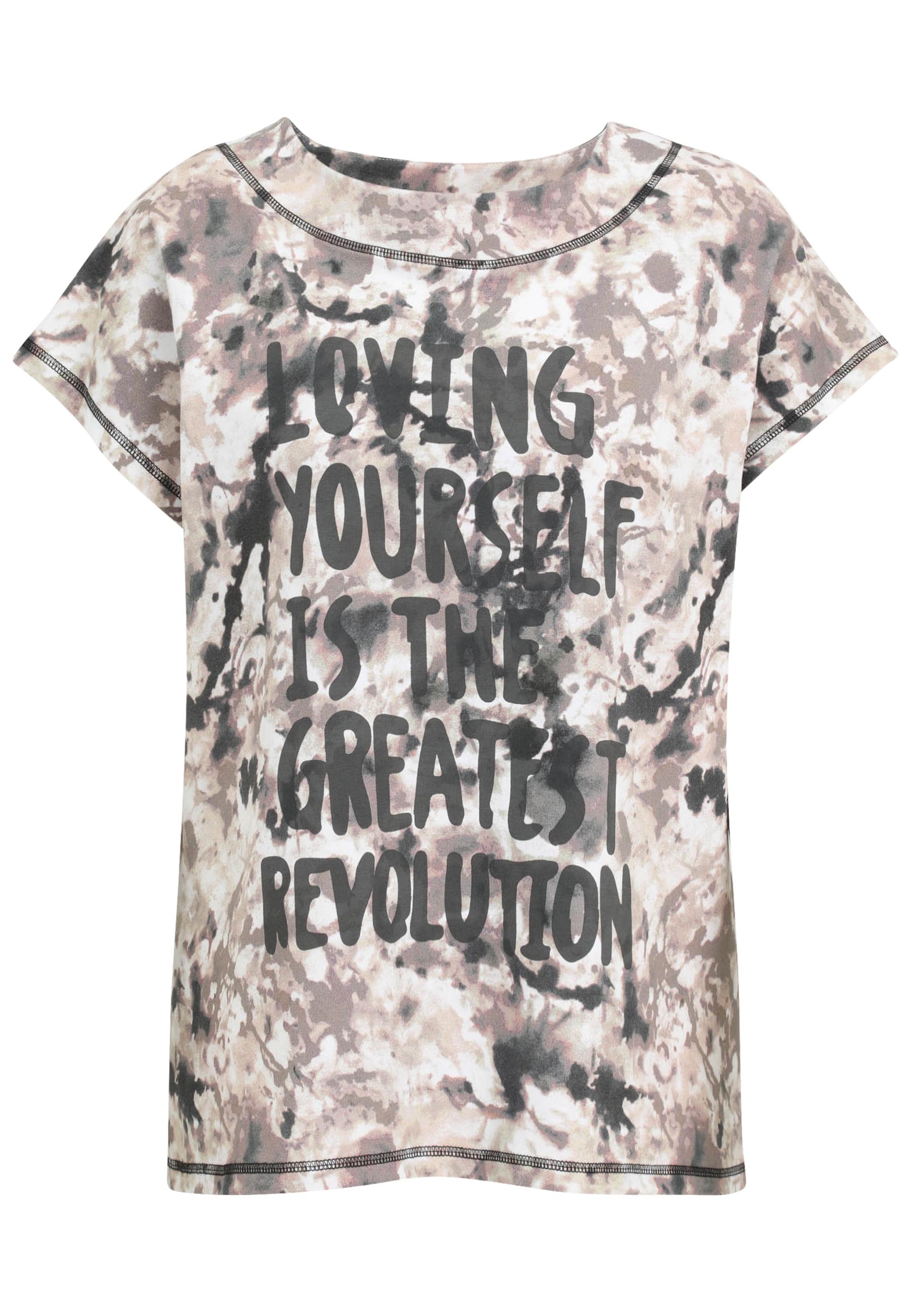 Dit beige Doris Streich T-shirt met modelnummer 337 167 heeft een meerkleurig dessin in een tie-dye optiek. Op de voorzijde staat de tekstprint LOVING YOURSELF IS THE GREATEST REVOLUTION in donkere letters. Het kledingstuk is voorzien van een ronde halslijn en korte mouwen. De afwerking bij de hals en de zomen bestaat uit een donker contraststiksel.