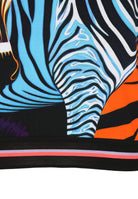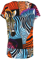 Dit Doris Streich T-shirt 580 303 Oranje is een casual shirt met korte mouwen en een klassieke ronde hals. Het dames T-shirt is voorzien van een meerkleurige, all-over opdruk die opgebouwd is uit vlakken met een zebrafiguur en abstracte tijgerstrepen in diverse tinten, waaronder oranje, blauw en zwart. De onderzijde van de top is afgewerkt met een zwarte sierrand met ingeweven, gekleurde horizontale strepen. Dit T-shirt is ontworpen door het merk Doris Streich en is een opvallende toevoeging aan je garderobe.