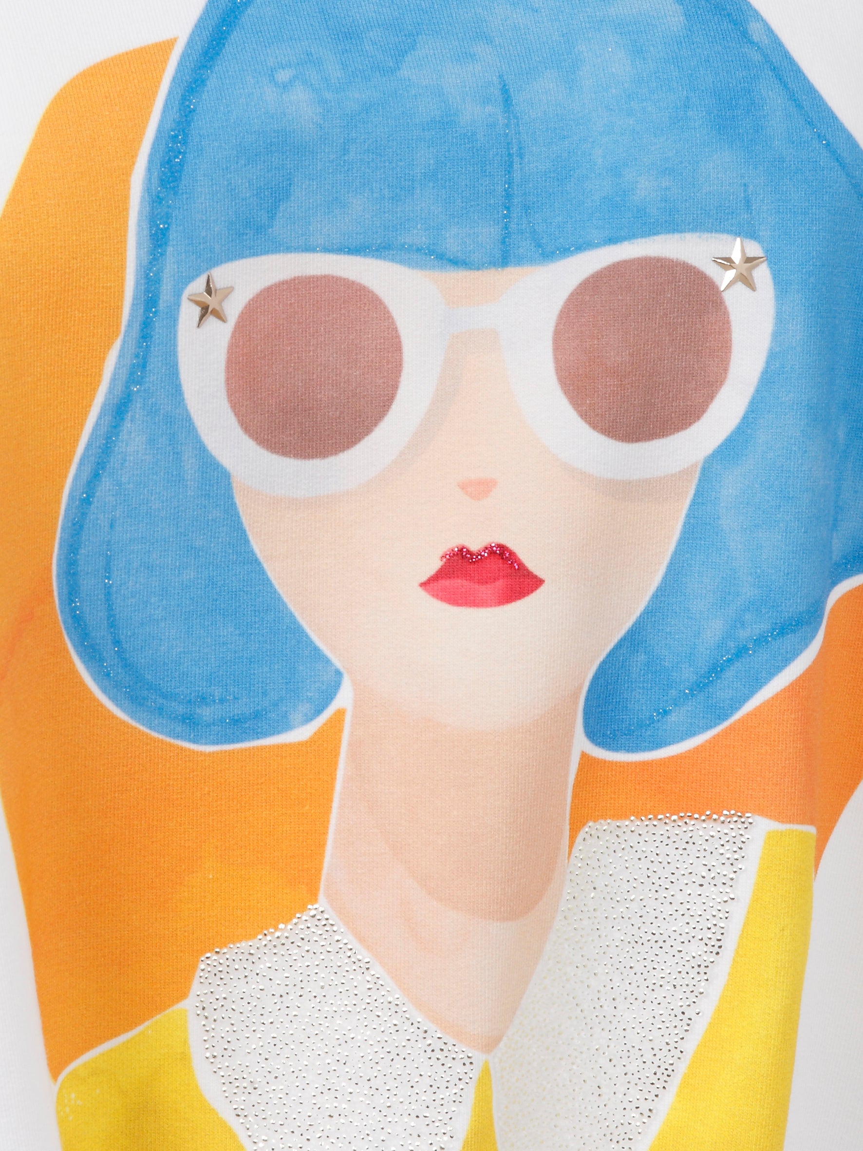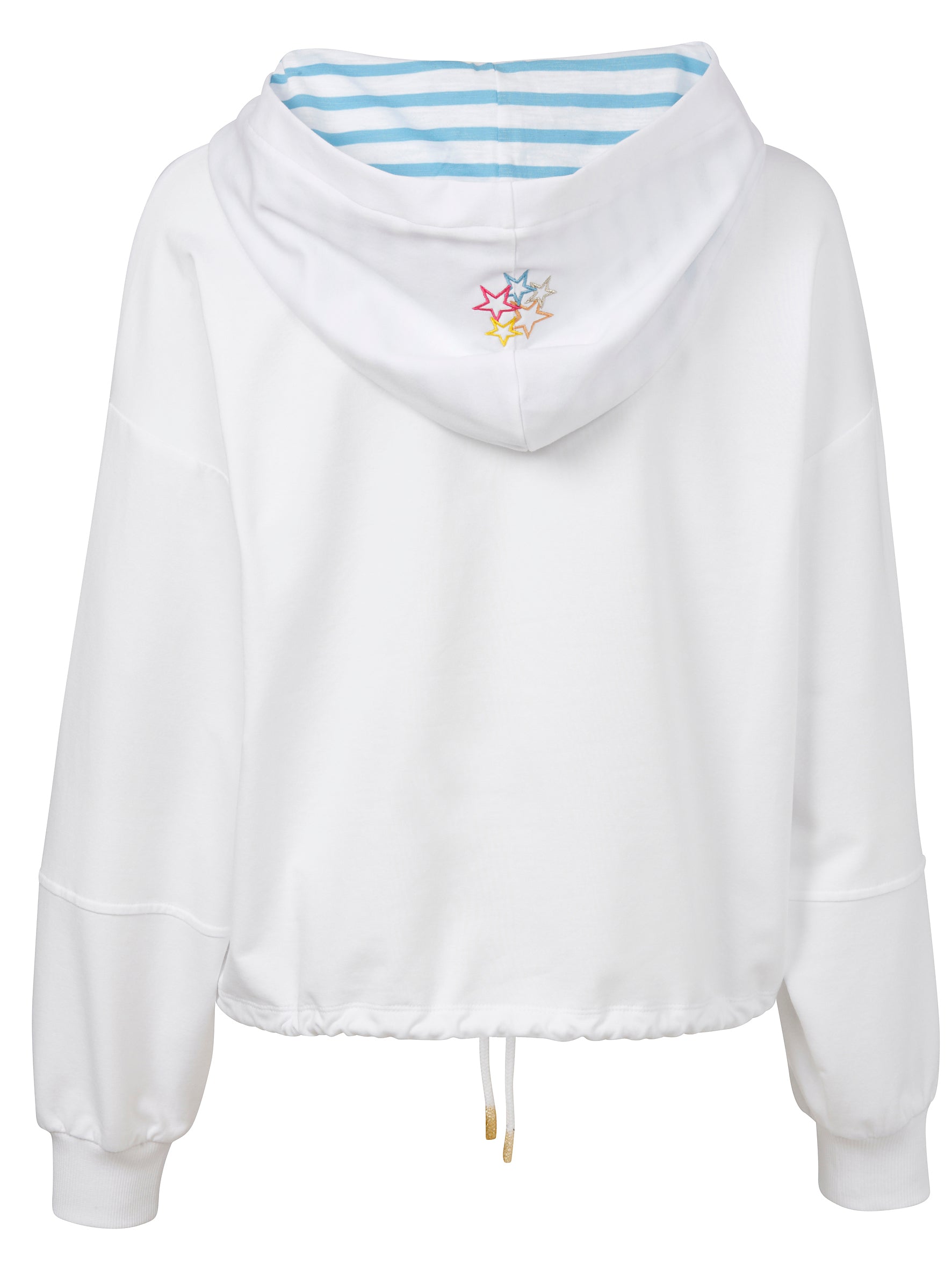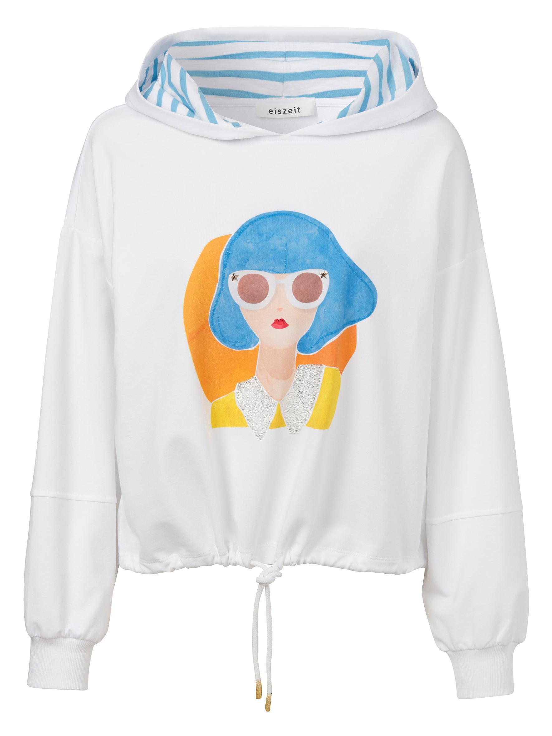 Deze witte sweater van het merk Eiszeit is voorzien van een grafische afbeelding op de voorzijde. De print toont een vrouw met blauw haar en een witte zonnebril tegen een oranje achtergrond. Het kledingstuk heeft een capuchon met een blauw en wit gestreept dessin aan de binnenzijde en geborduurde sterren op de achterkant. De mouwen eindigen in elastische boorden en de onderkant bevat een verstelbaar koord.