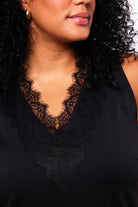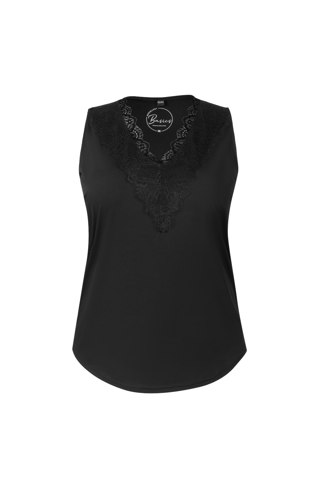 Deze Exxcellent Top is een mouwloze tanktop in een effen zwarte kleur. Het kledingstuk is afgewerkt met een verfijnd kanten detail langs de V-hals, wat zorgt voor een moderne uitstraling. De rechte pasvorm draagt comfortabel. Deze zwarte top van Exxcellent is ideaal als basis item. Het is een veelzijdige dames top die geschikt is voor diverse casual gelegenheden, en makkelijk te combineren.Pasvorm en Stijladvies