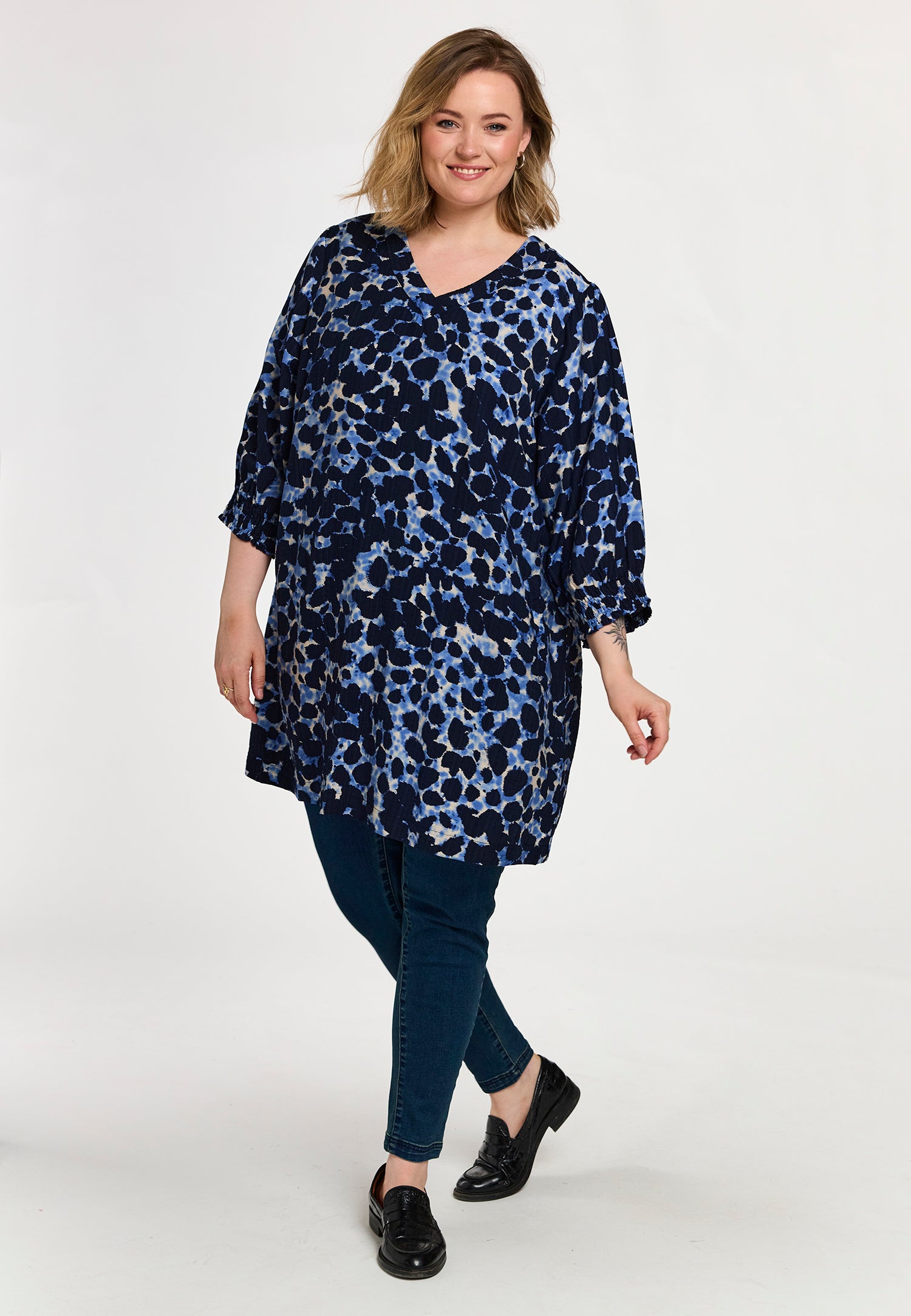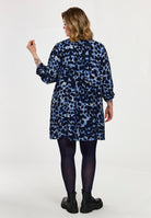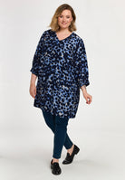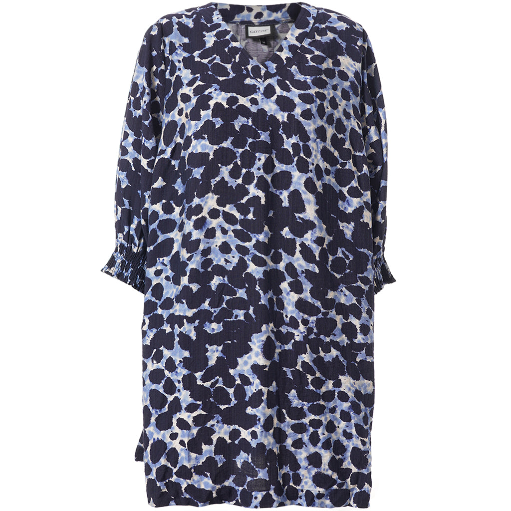 De Gozzip Tuniek G261004 Blauw is een korte tuniek met een all-over vlekjesdessin in donkerblauwe, lichtblauwe en crème tinten. Deze casual tuniek van het merk Gozzip heeft een V-hals en lange mouwen. De uiteinden van de mouwen zijn afgewerkt met een gesmokte, elastische manchet. Het losvallende model heeft een comfortabele pasvorm. Deze Gozzip jurk is voorzien van twee steekzakken aan de zijkant.Pasvorm en Stijladvies