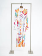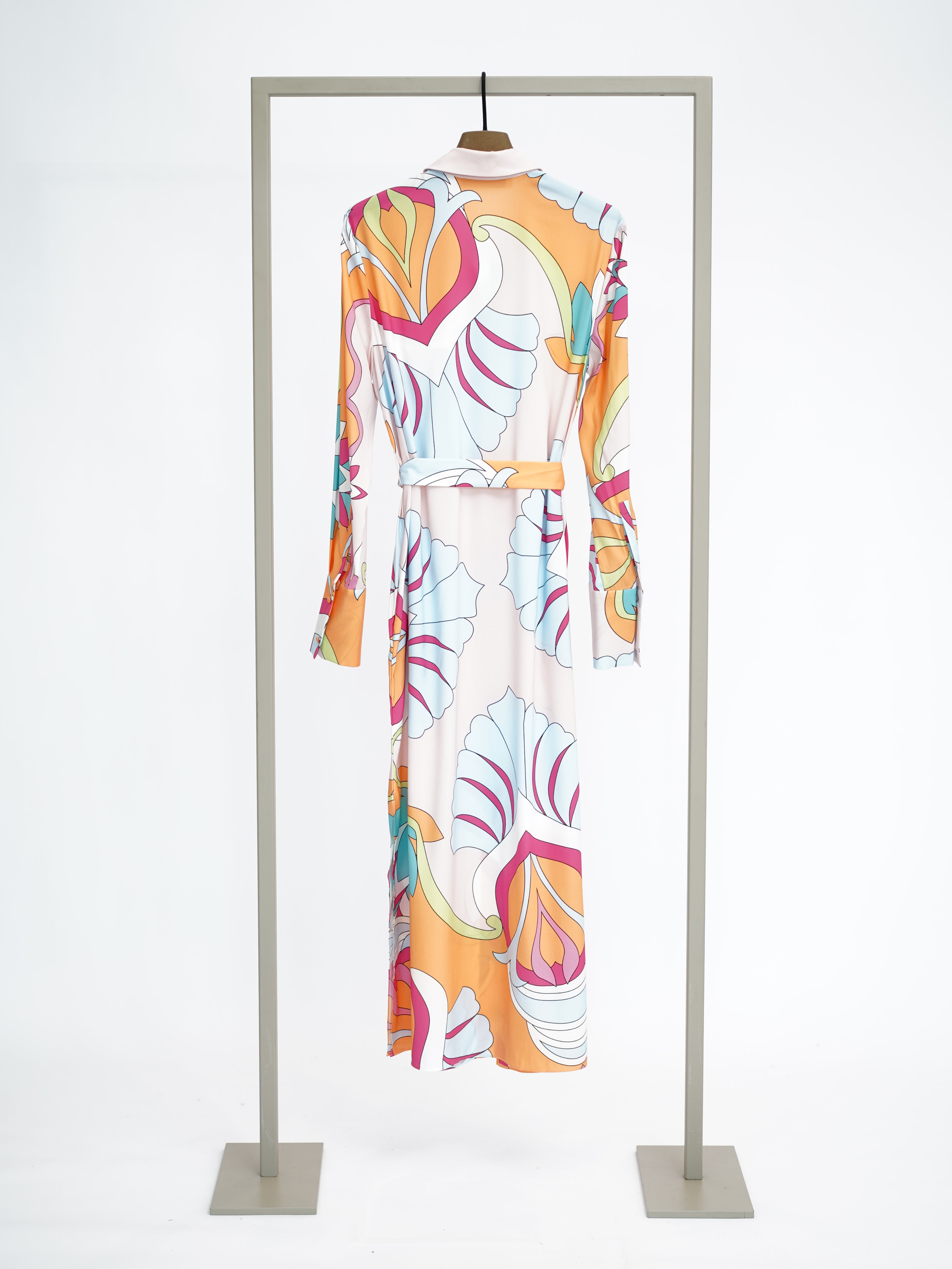 Deze Herzens jurk 25261-6064 Multi is een lange overhemdjurk met een abstract bloemen dessin in oranje, roze en blauwtinten. De jurk is voorzien van een klassieke kraag en lange mouwen met manchetten. Het kledingstuk sluit middels een knoopsluiting over de gehele lengte aan de voorzijde. Een smalle, afneembare ceintuur in effen oranje is inbegrepen om de taille te accentueren.