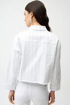 Dit korte witte dames jack van JOSEPH RIBKOFF is uitgevoerd in een stevige katoenmix. Het spijkerjasje heeft een klassieke overhemdkraag en sluit met een volledige rij zilverkleurige metalen knopen. De voorzijde is voorzien van twee klepzakken op de borst, elk afgesloten met een knoop. Het ontwerp wordt verrijkt met een subtiel verticaal streeppatroon van glimmende strass steentjes over het gehele kledingstuk. De onderrand van het jasje is afgewerkt met een rauwe, gerafelde zoom.Pasvorm en Stijladvies