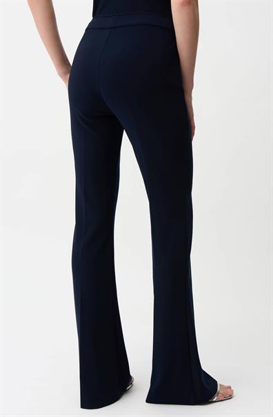 Deze donkerblauwe broek van Jospeh Ribkoff is ontworpen met een hoge taille en heeft een brede, platte tailleband. De pantalon heeft een aansluitende pasvorm tot aan de knie, waarna de pijp subtiel uitloopt. Dit model 163099s26 heeft een volledig effen dessin en is afgewerkt met een glad weefsel. De achterzijde toont een doorlopende belijning.Pasvorm en Stijladvies