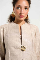 Dit Jospeh Ribkoff jack, uitgevoerd in een goudkleurige tint, kenmerkt zich door het subtiele geweven structuurdessin. Het korte damesjasje is voorzien van een opstaande kraag met een V-split aan de voorzijde. De sluiting bestaat uit twee ronde, decoratieve knopen met een abstract goudkleurig design. Dit casual blazer heeft driekwarts mouwen die uitlopen en aan de manchet voorzien zijn van een kleine split. Het kledingstuk valt recht en biedt een comfortabele pasvorm voor jou.
