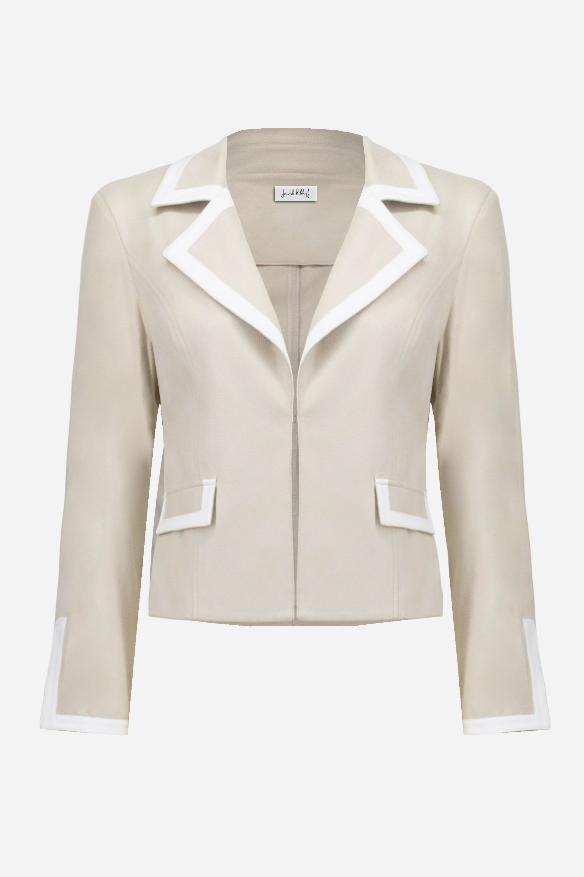Dit Jospeh Ribkoff JACK 261912 is een beige jasje met een korte snit die tot de taille valt. Het dames colbert is uitgevoerd met een opvallende reverskraag en opgestikte paspelzakken aan de voorzijde. Contrasterende witte biezen accentueren de kraag, de zakken en de mouwuiteinden. Dit Jospeh Ribkoff jasje is openvallend en is een moderne toevoeging aan je garderobe.