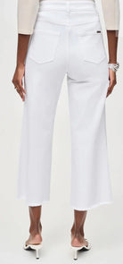 Deze witte Jospeh Ribkoff jeans 251901S26 is uitgevoerd in een casual wide-leg model. De cropped denim broek heeft een hoge taille en sluit met een knoop. Aan de voorzijde zie je twee ruime opgestikte zakken en verticale siernaden met strass. De pijpen eindigen in een lichte franje zoom en zijn voorzien van korte splitten aan de onderkant. Dit ontwerp van Jospeh Ribkoff biedt je een comfortabele pasvorm voor dagelijks gebruik.