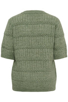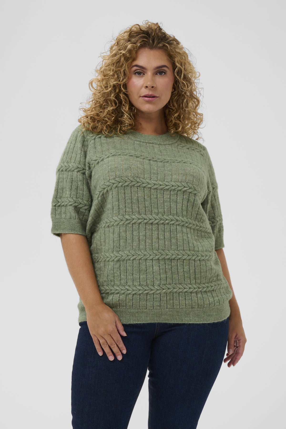 Deze gebreide trui van Kaffe curve, uitgevoerd in de tint Sea Spray Melange, heeft korte mouwen en een ronde hals. Het casual ontwerp kenmerkt zich door de zichtbare verticale en gevlochten kabelpatronen over het gehele voor- en achterpand. Dit is een comfortabel kledingstuk dat reikt tot de heup, ideaal als je zoekt naar een moderne en nuchtere stijl.