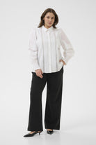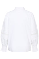 De Kaffe curve blouse 2007 10583910 in Optical White is een feitelijke toevoeging aan je garderobe. Deze witte damesblouse van Kaffe curve heeft een klassieke ronde kraag en een knoopsluiting over de gehele lengte. Je ziet verfijnde verticale plooien en kanten inzetstukken aan de voorzijde en op de lange pofmouwen. De mouwen eindigen in een gesmokte manchet, wat zorgt voor volume en detail.