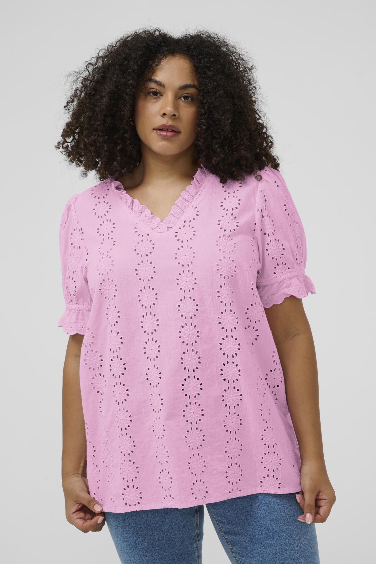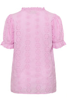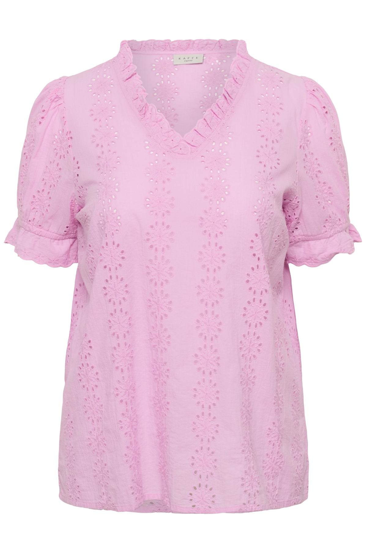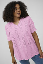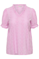 Deze roze top van Kaffe Curve heeft een verticaal bloemendessin in een opengewerkte borduurtechniek. Het item bevat een v-hals met een kleine ruche langs de rand. De korte mouwen eindigen in een elastische zoom met ruches. Door de rechte snit en de lichte stof draagt het kledingstuk comfortabel.