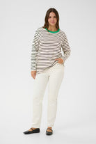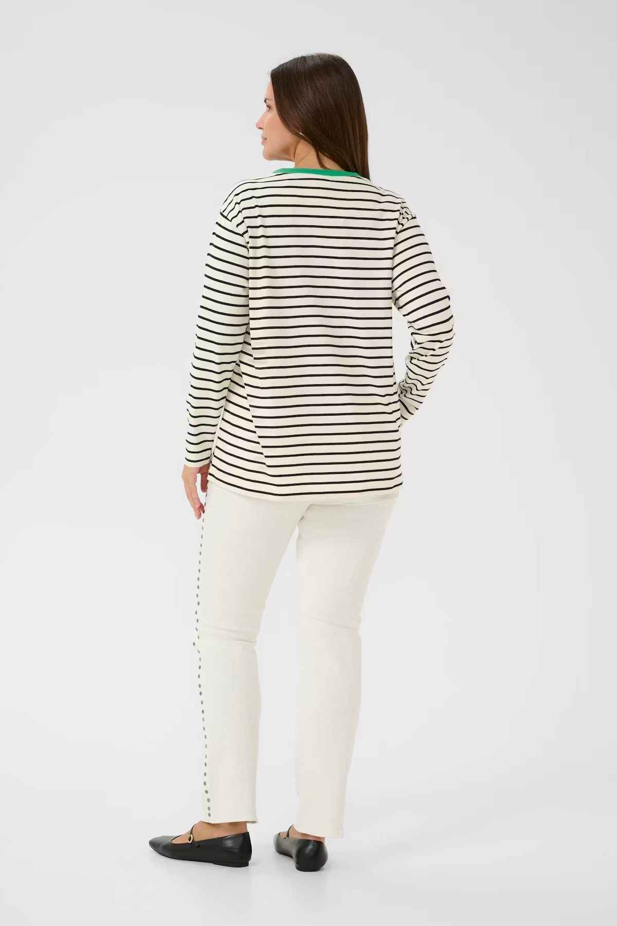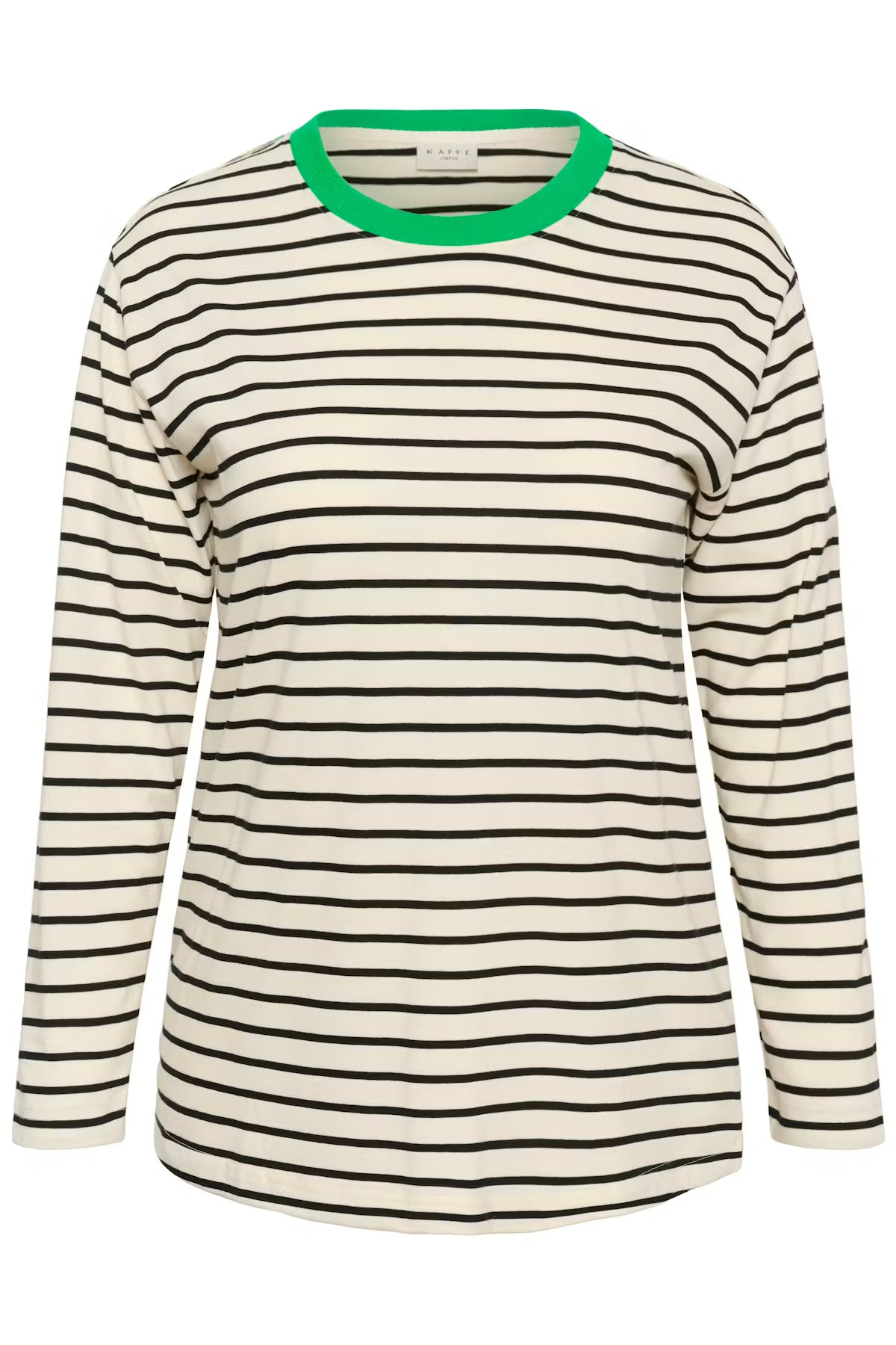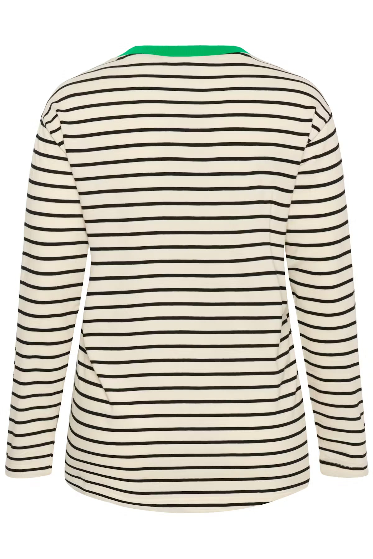Kaffe curve Gestreept Longsleeve T-Shirt Wit Zwart met Groene Halslijn