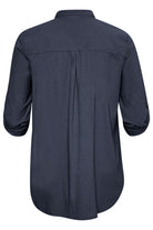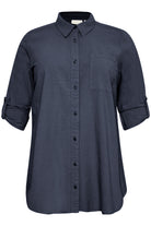 Deze tuniek van Kaffe Curve is uitgevoerd in een egale donkerblauwe kleur met een subtiele structuur in de stof. Het item heeft een klassieke kraag en een knoopsluiting over de volledige lengte aan de voorzijde. Op de linkerborst bevindt zich een enkele opgestikte zak. De mouwen zijn voorzien van een ophaallus met knoop waardoor je de mouwlengte naar wens aanpast. De achterzijde is afgewerkt met een schouderpas en een verticale plooi.Pasvorm en Stijladvies