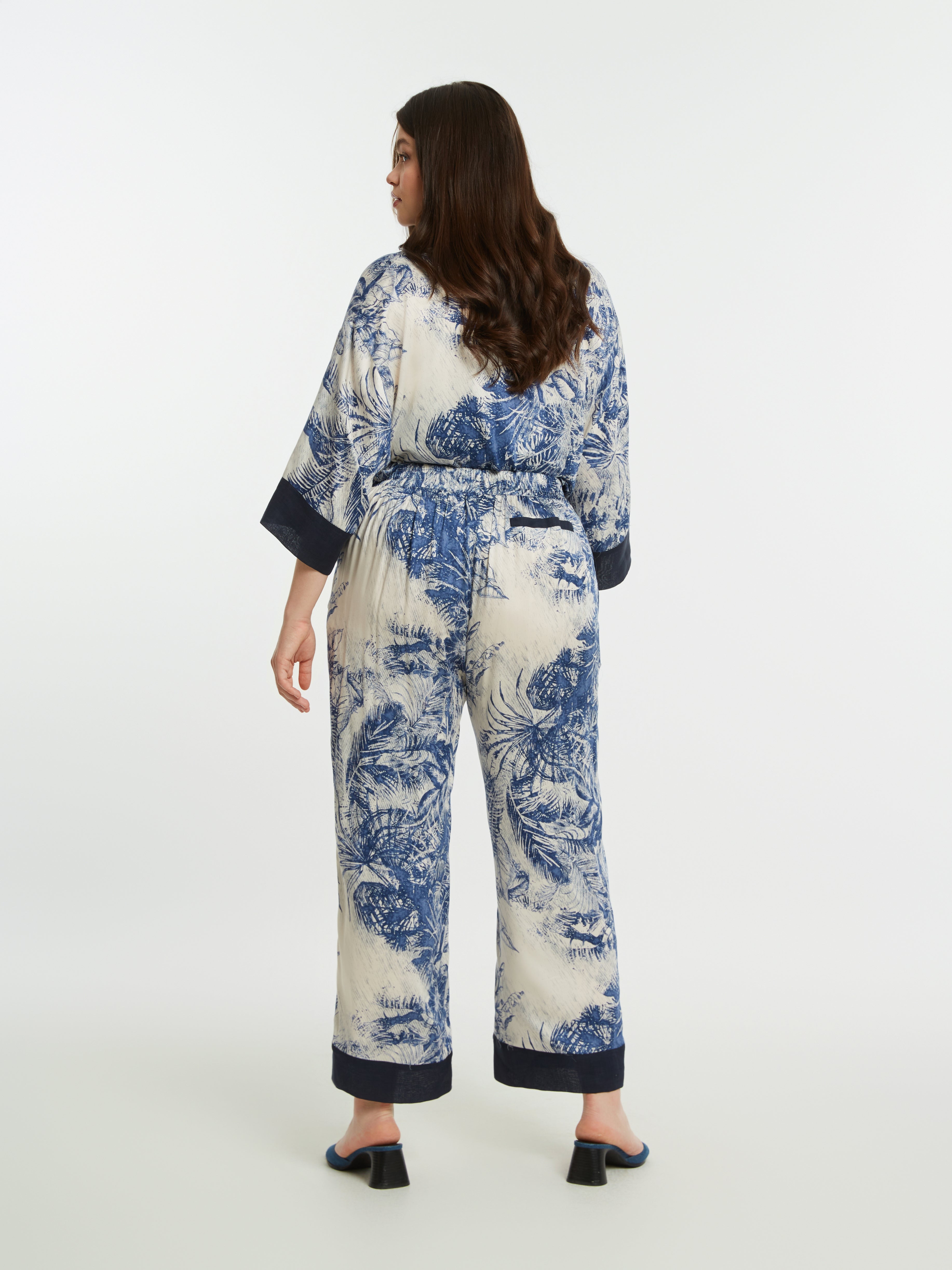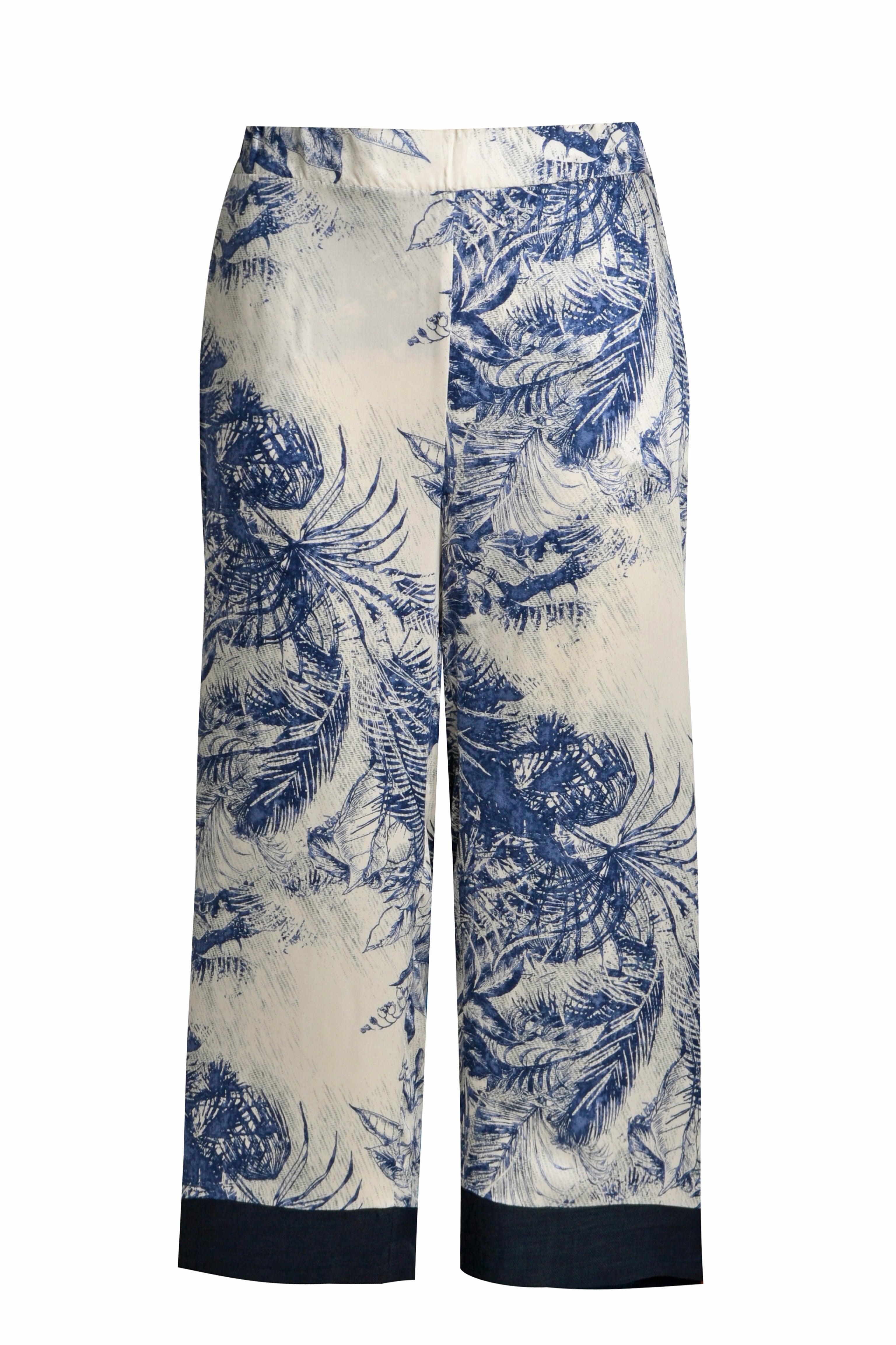 Deze casual MAT broek met een eigentijds dessin in blauw en crème is een fijne toevoeging aan je garderobe. De comfortabele damesbroek heeft een wijde, rechte pasvorm en is voorzien van een elastische tailleband voor draaggemak. Aan de achterzijde is één opgestikte zak met een donkerblauwe bies geplaatst. De pijpen zijn afgewerkt met een brede donkerblauwe zoom. Dit model is een luchtige pantalon voor een casual uitstraling.Pasvorm en Stijladvies