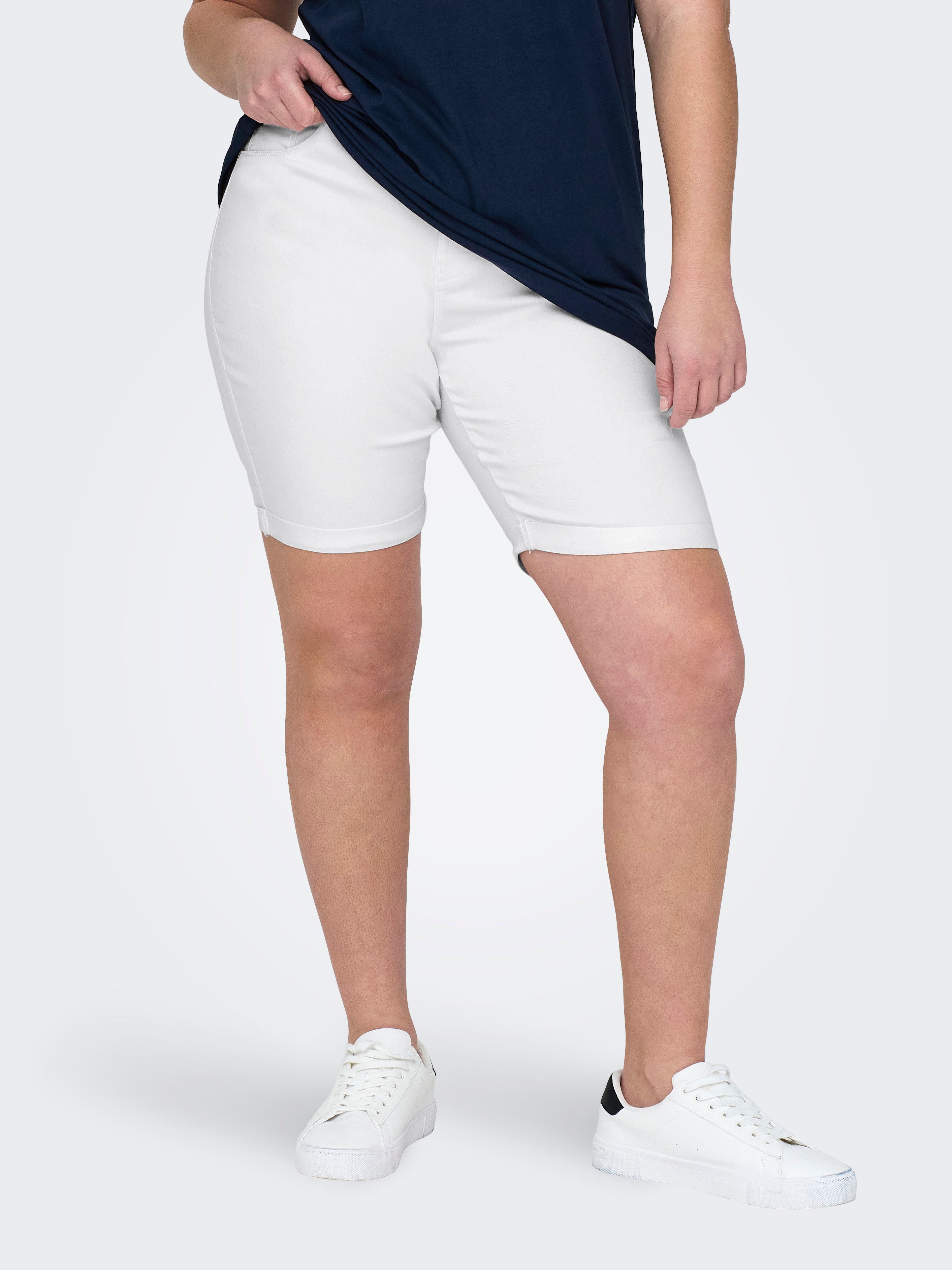 De bermuda heeft een aansluitende pasvorm met stretch. Door de witte kleur kun je deze korte broek makkelijk combineren met felgekleurde of donkere shirts. Probeer de bermuda met eenvoudige sneakers en een losvallende top van Only Carmakoma voor een zomerse, optimistische look.Productkenmerken