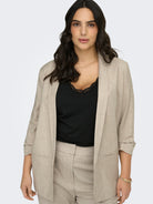 Dit moderne dames colbert van Only Carmakoma in de kleur White Pepper heeft een openvallend ontwerp. De blazer is voorzien van een sjaalkraag en gerimpelde 3/4 mouwen. Aan de voorzijde vind je twee functionele paspelzakken. Het jasje heeft een gladde voering en een licht gestructureerde weving. Dit is een casual en toegankelijk jasje voor grote maten dat comfortabel draagt.Pasvorm en Stijladvies