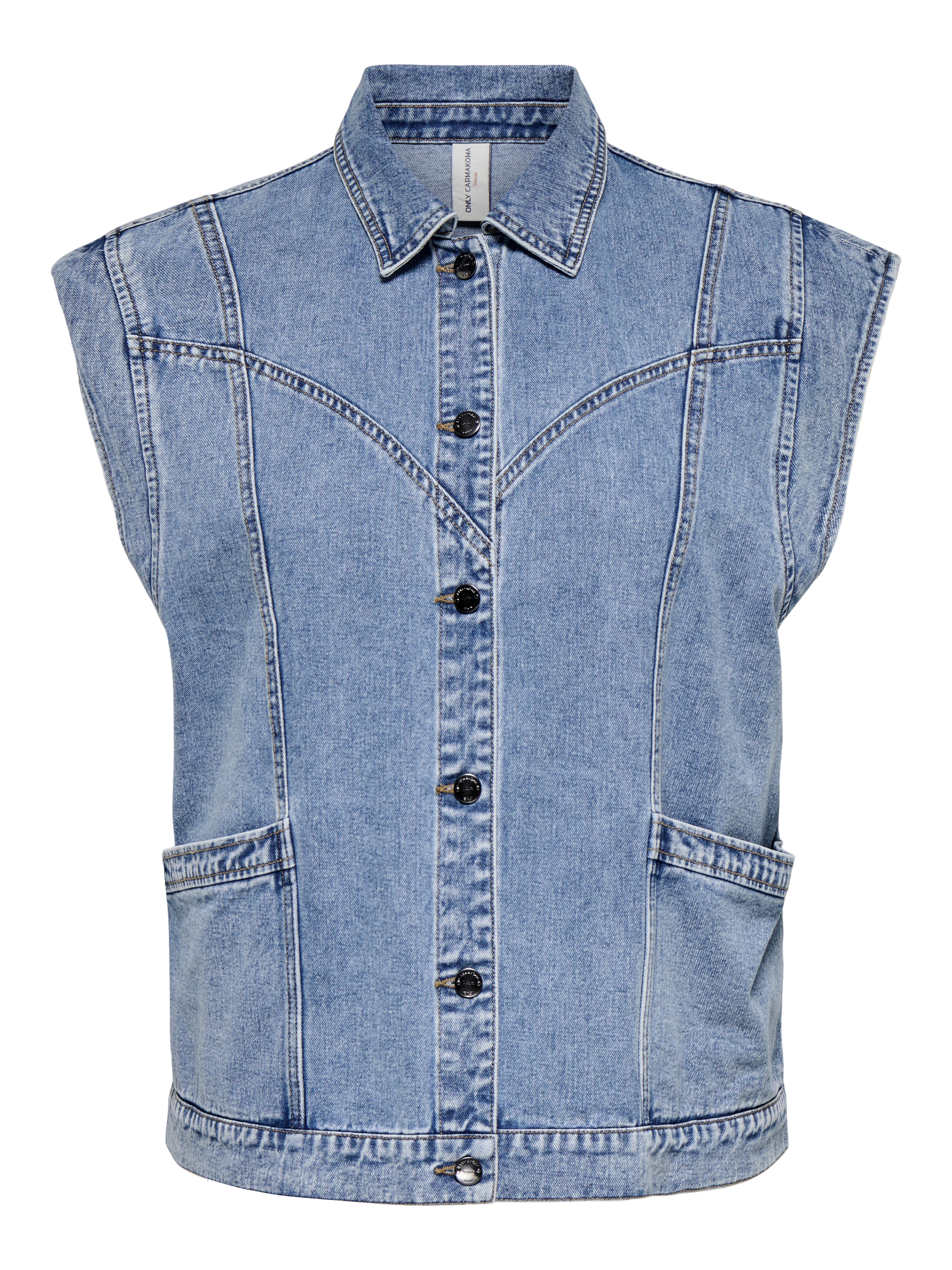 Dit Only Carmakoma Bodywarmer in Medium Blue Denim is een mouwloos spijkergilet met een casual uitstraling. Het vest, onderdeel van de Bestseller collectie, heeft een klassieke shirtkraag en sluit aan de voorzijde met donkere knopen. De gestikte naden op de borst en rug geven dit moderne denim vest een Western-geïnspireerde touch. Aan de onderzijde bevinden zich twee ruime, opgestikte steekzakken. Dit spijkergilet met productnummer 15364493 is ontworpen voor een comfortabele pasvorm.