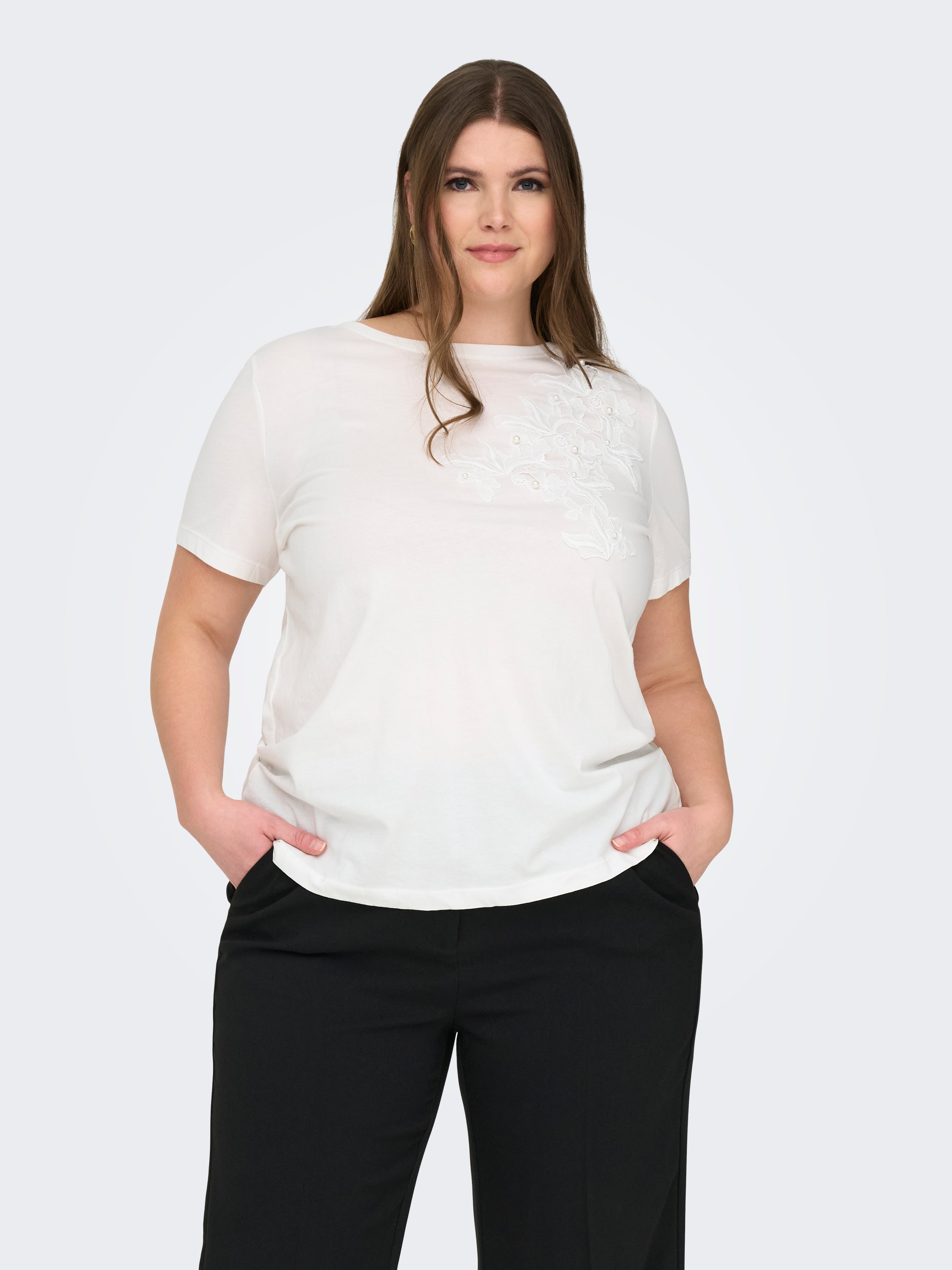 Dit casual Only Carmakoma T-shirt met korte mouwen en ronde hals is een comfortabele keuze voor dagelijks gebruik. Het shirt in de kleur Cloud Dancer heeft een opvallende, geborduurde bloemvormige applicatie op de borst. Deze decoratieve touch bevat kleine parelachtige details. Het bovenstuk heeft een rechte pasvorm en valt tot op de heup, wat zorgt voor een relaxte uitstraling.