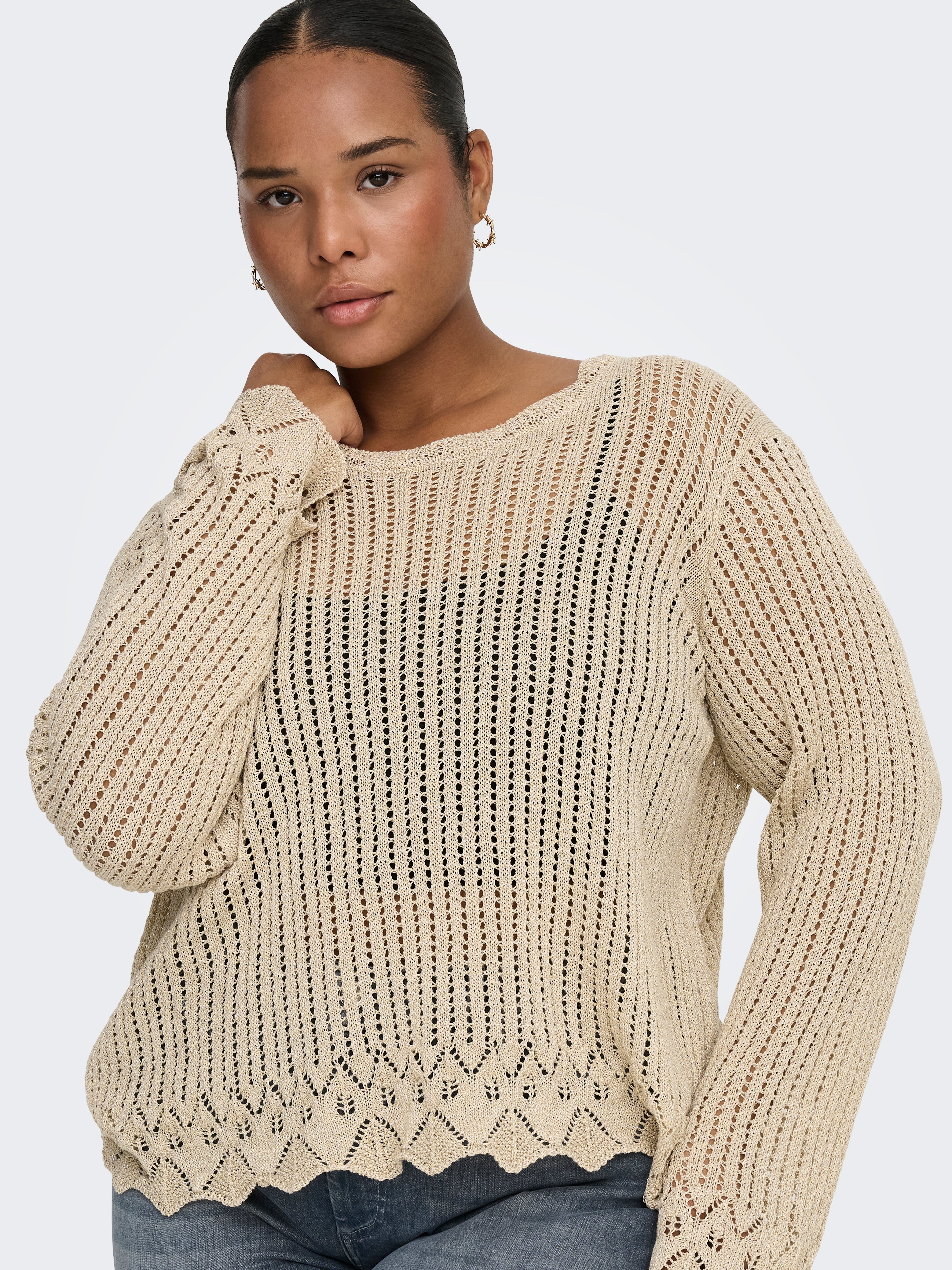 Deze gebreide trui van Only Carmakoma in Pale Gold is een moderne toevoeging aan je garderobe. De pullover heeft een grof opengewerkt breisel met verticale steken. De lange mouwen en de wijde, ronde halslijn zorgen voor een nonchalante pasvorm. De onderkant van de trui is afgewerkt met een geschulpte rand in een decoratief patroon. De toevoeging van metallic vezels geeft het breisel een subtiele goudkleurige glans, wat zorgt voor een casual en optimistische uitstraling.Pasvorm en Stijladvies
