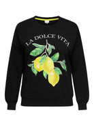 Deze Only Carmakoma sweater, onderdeel van de Bestseller groep, heeft een casual uitstraling. De zwarte trui is afgewerkt met ribboorden langs de ronde halslijn, de manchetten en de onderzijde. Op de voorzijde van deze dames trui zie je een opvallende grafische print van gele citroenen met daarboven de tekstopdruk 'LA DOLCE VITA'. De achterzijde van dit sweatshirt is voorzien van de tekstopdruk 'SQUEEZE THE DAY!' in een groene kleur.