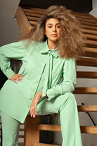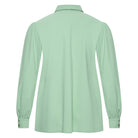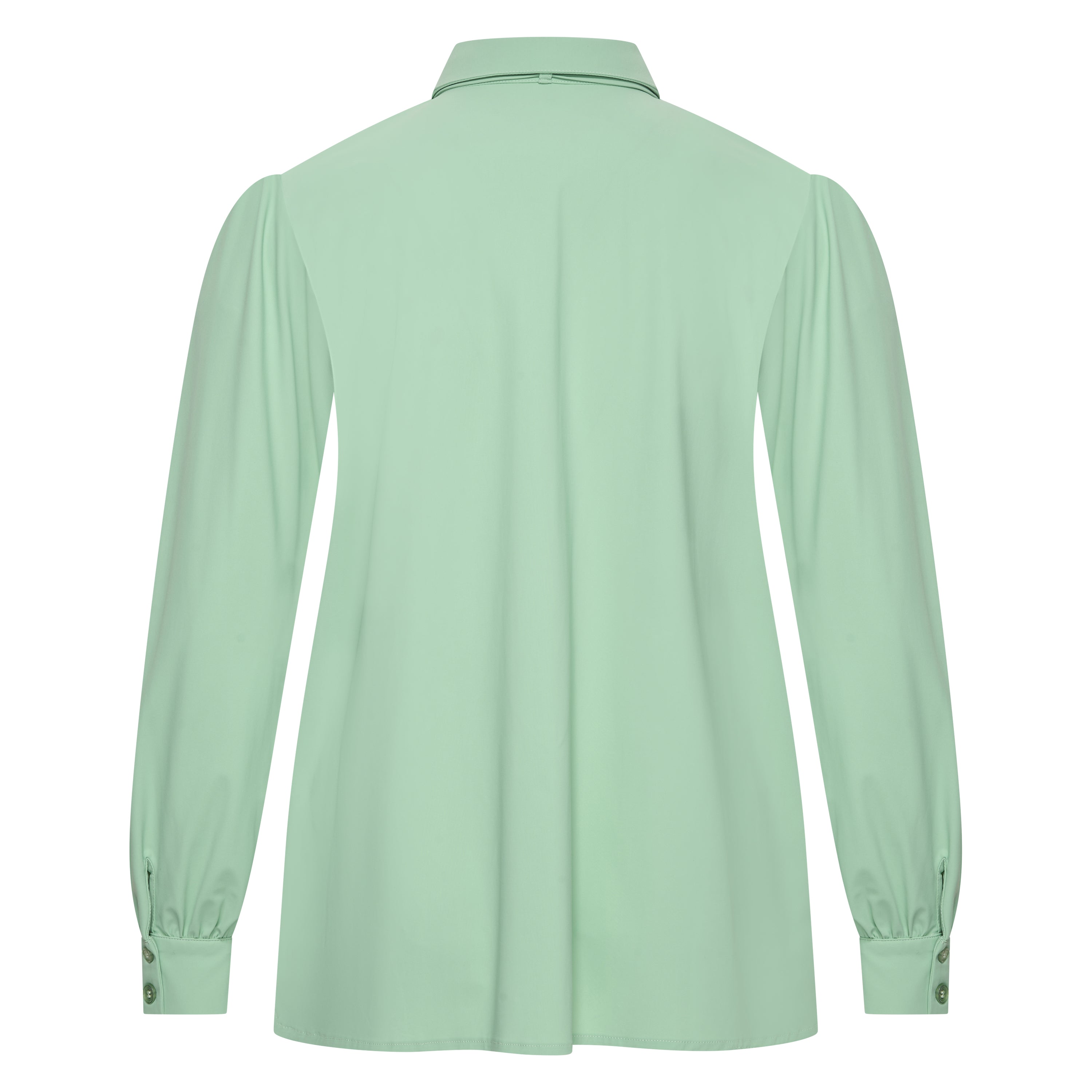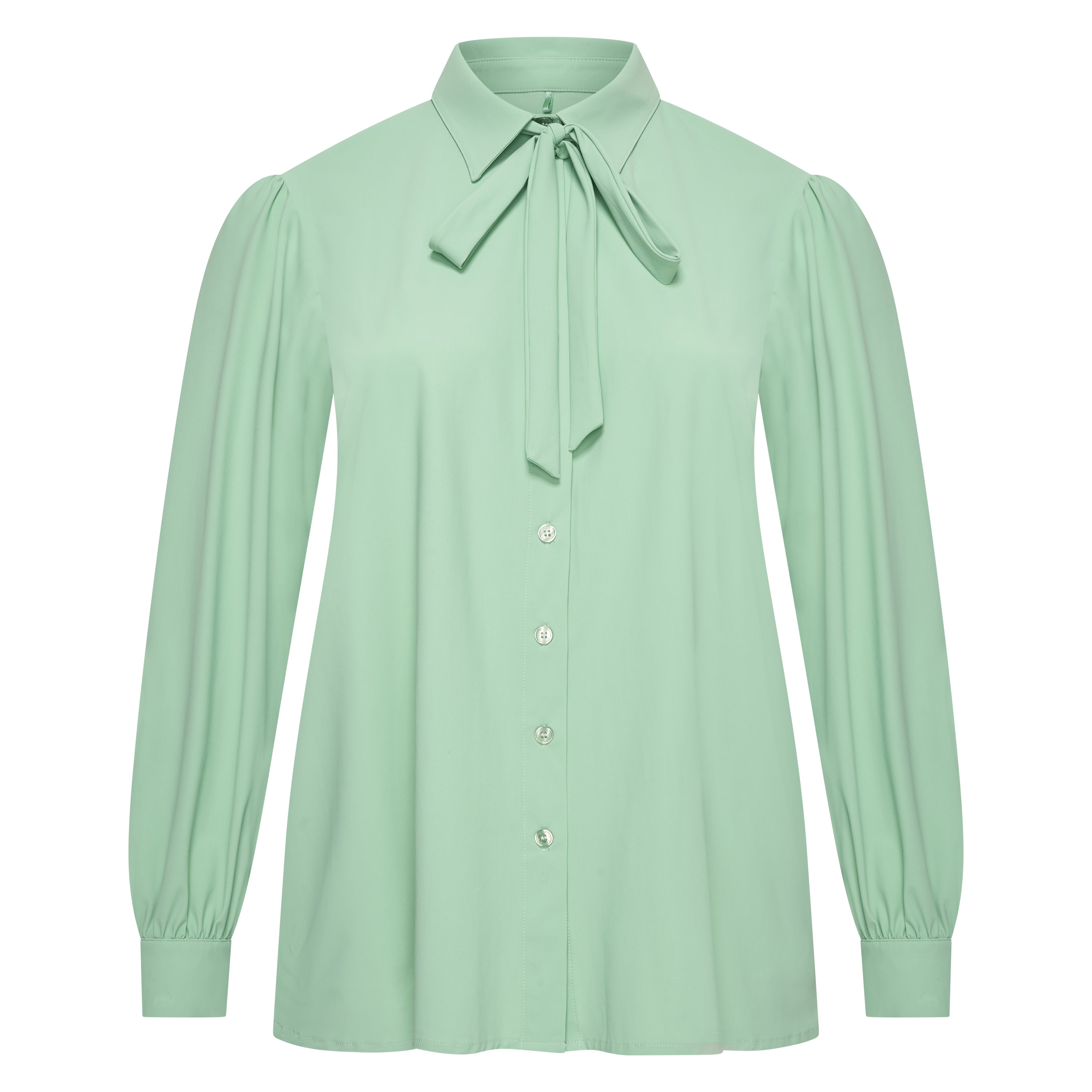 Dit lange mouwen shirt van PlusBasics in een frisse groene kleur heeft een klassieke rechte pasvorm met een doorlopende knoopsluiting aan de voorzijde. De gladde, geweven stof voelt licht en soepel aan. Het kledingstuk is uitgevoerd met een overhemdkraag waaraan een strikdetail is vastgemaakt. De mouwen hebben subtiel gepofte schouders en worden afgesloten met manchetten die zijn voorzien van dubbele knopen.