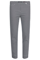 Deze aansluitende damesbroek van het merk Robell heeft een opvallend geometrisch dessin. De print bestaat uit een herhalend patroon in de kleuren zwart en wit. Dit model, onderdeel van de Godske Group, is uitgevoerd als een moderne enkelbroek. De tailleband oogt glad en is afgewerkt met een kleine metalen stud bij de heup. Dit item is perfect als jij comfortabele stretch broeken zoekt met een stijlvol patroon.