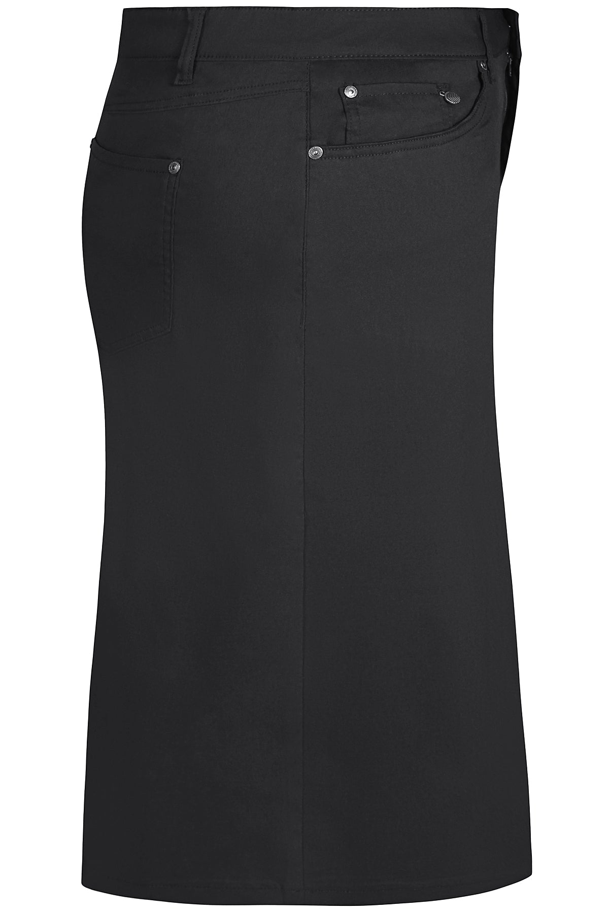 Deze Zhenzi Rok 201314 Zwart is een effen damesrok in een rechte pasvorm. De rok heeft een traditionele jeans-stijl tailleband met een rits en een zilverkleurige knoop als sluiting. Zowel aan de voorzijde als de achterzijde is dit kledingstuk voorzien van een verticale middennaad. Je vindt twee schuine steekzakken voorop en twee opgestikte zakken aan de achterkant. Alle zakopeningen zijn afgewerkt met metalen rivets. Dit is een casual zwarte rok die je makkelijk combineert.Pasvorm en Stijladvies