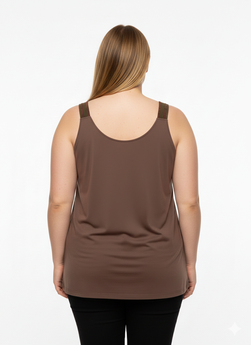 Deze MXMS mouwloze top 226.06DG Beige is een casual kledingitem met een effen dessin. Het basic model is uitgevoerd met een diepe ronde halslijn en brede schouderbanden. De schouderbanden hebben een contrasterend decoratief weefsel aan de bovenkant. De tanktop heeft een langere pasvorm die tot over de heup valt. Dit item voelt licht en comfortabel aan en is een neutrale toevoeging aan je garderobe, geschikt om te dragen als onderkleding of solo.