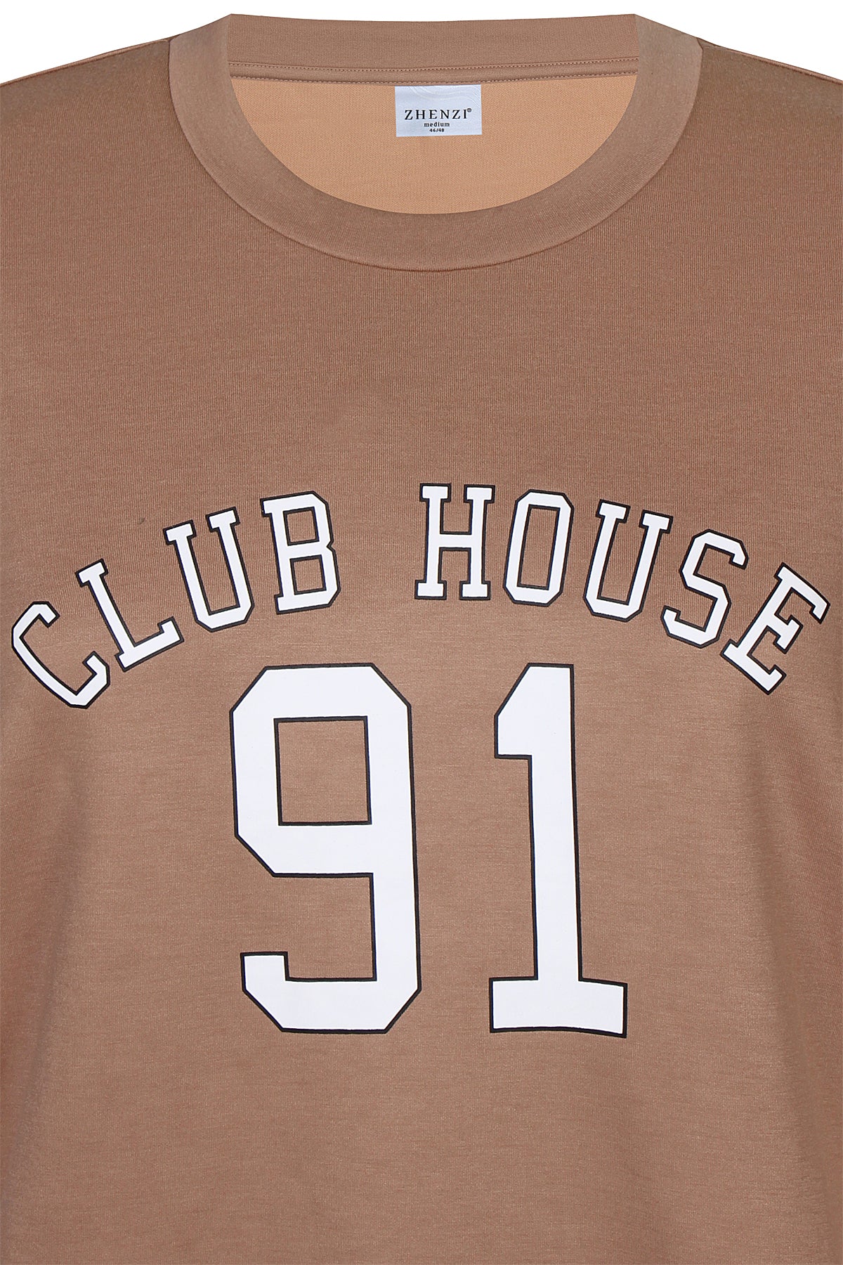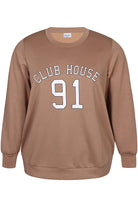 Deze bruine trui van Zhenzi heeft een ronde hals en lange mouwen. Het kledingstuk is voorzien van elastische boorden bij de polsen en aan de onderzijde. Op de voorzijde staat de tekst CLUB HOUSE 91 in witte letters met een zwarte omlijning. De trui valt soepel door de combinatie van viscose en polyester en heeft een egale achterkant.
