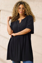 Deze zwarte tuniek van Zhenzi heeft een effen dessin en is voorzien van een knoopsluiting aan de voorzijde. Het model heeft korte mouwen en een V-hals die doorloopt in de knopen. Onder de borstlijn bevindt zich een naad met plooien wat zorgt voor een wijder uitlopende pasvorm. Het kledingstuk valt soepel over de heupen en biedt veel bewegingsvrijheid.