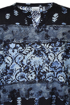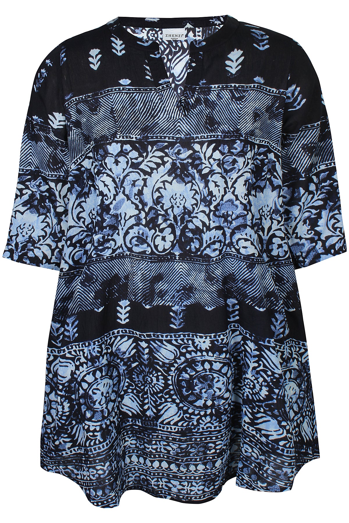 Deze tuniek van het merk Zhenzi is voorzien van een gedetailleerde print in diverse blauwtinten op een zwarte basis. Het item heeft een split bij de halslijn en een kleine opstaande kraag. De halflange mouwen en de rechte snit dragen bij aan een luchtige valling. De patronen in het dessin bestaan uit florale motieven en grafische lijnen die horizontaal over het kledingstuk zijn verdeeld.