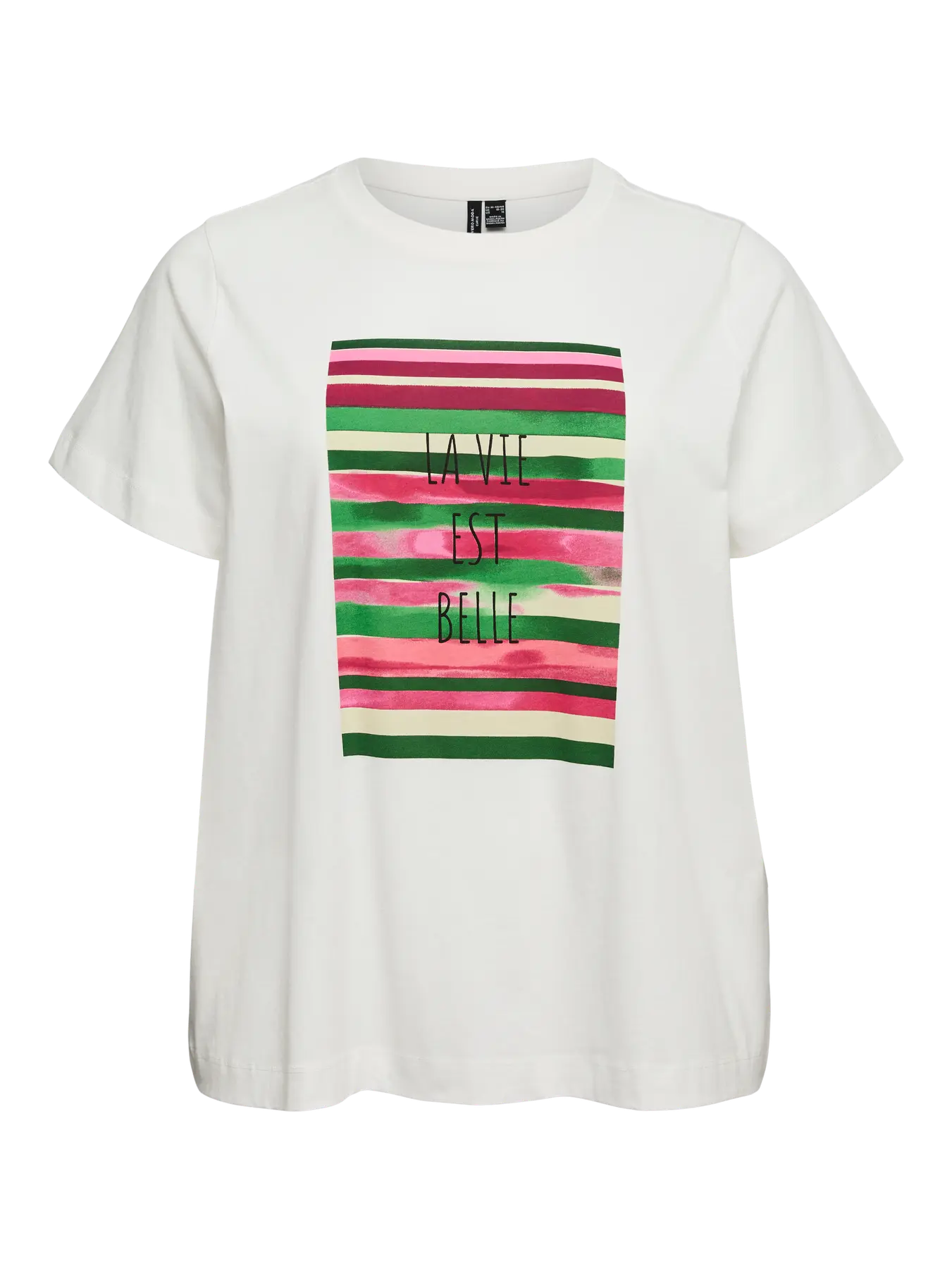 Dit casual witte T-shirt van het merk Vero Moda Curve heeft korte mouwen en een ronde hals. Het katoenen bovenstuk heeft een rechte pasvorm. Centraal op de borst bevindt zich een rechthoekige grafische print met horizontale strepen in roze, bordeaux en groen. Binnen dit dessin is de tekst "LA VIE EST BELLE" verticaal gecentreerd gedrukt. Dit grafische T-shirt is onderdeel van de Bestseller collectie.Pasvorm en Stijladvies