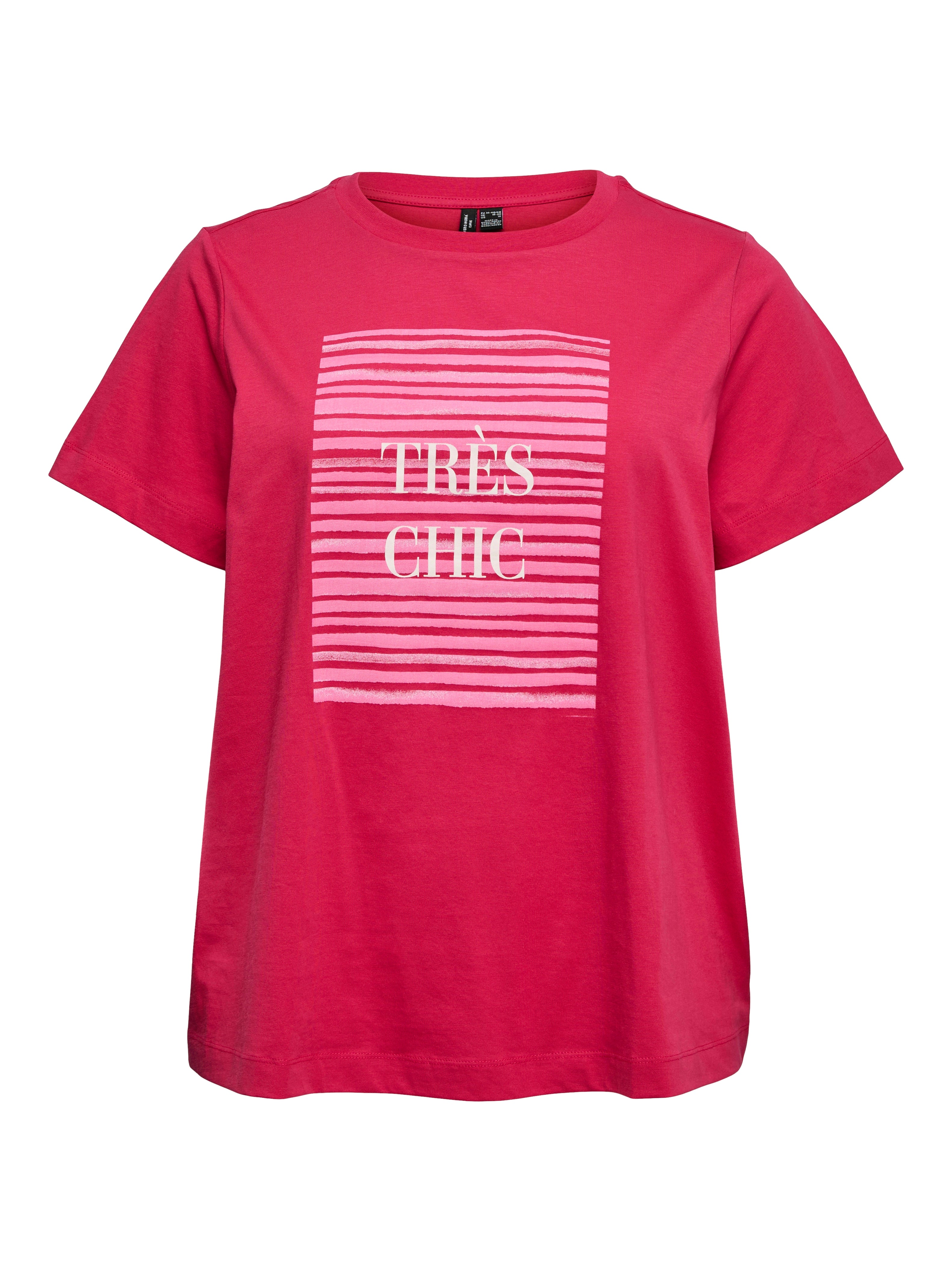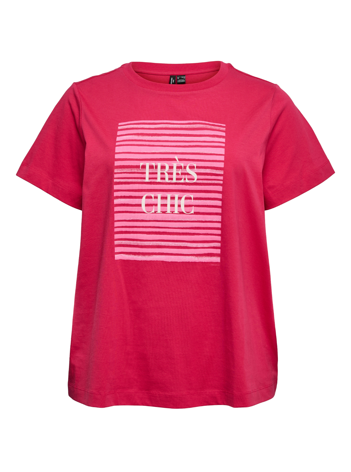 Dit Vero Moda Curve T-shirt in helder roze kleur is uitgevoerd met een ronde halslijn en korte mouwen. Het katoenen shirt heeft een rechte pasvorm. Op de voorkant staat een print bestaande uit horizontale roze strepen in een rechthoek met de witte tekst 'TRÈS CHIC'. Dit bovenstuk is ideaal als casual shirt voor een moderne look, waardoor je het makkelijk combineert met je favoriete items.Pasvorm en Stijladvies