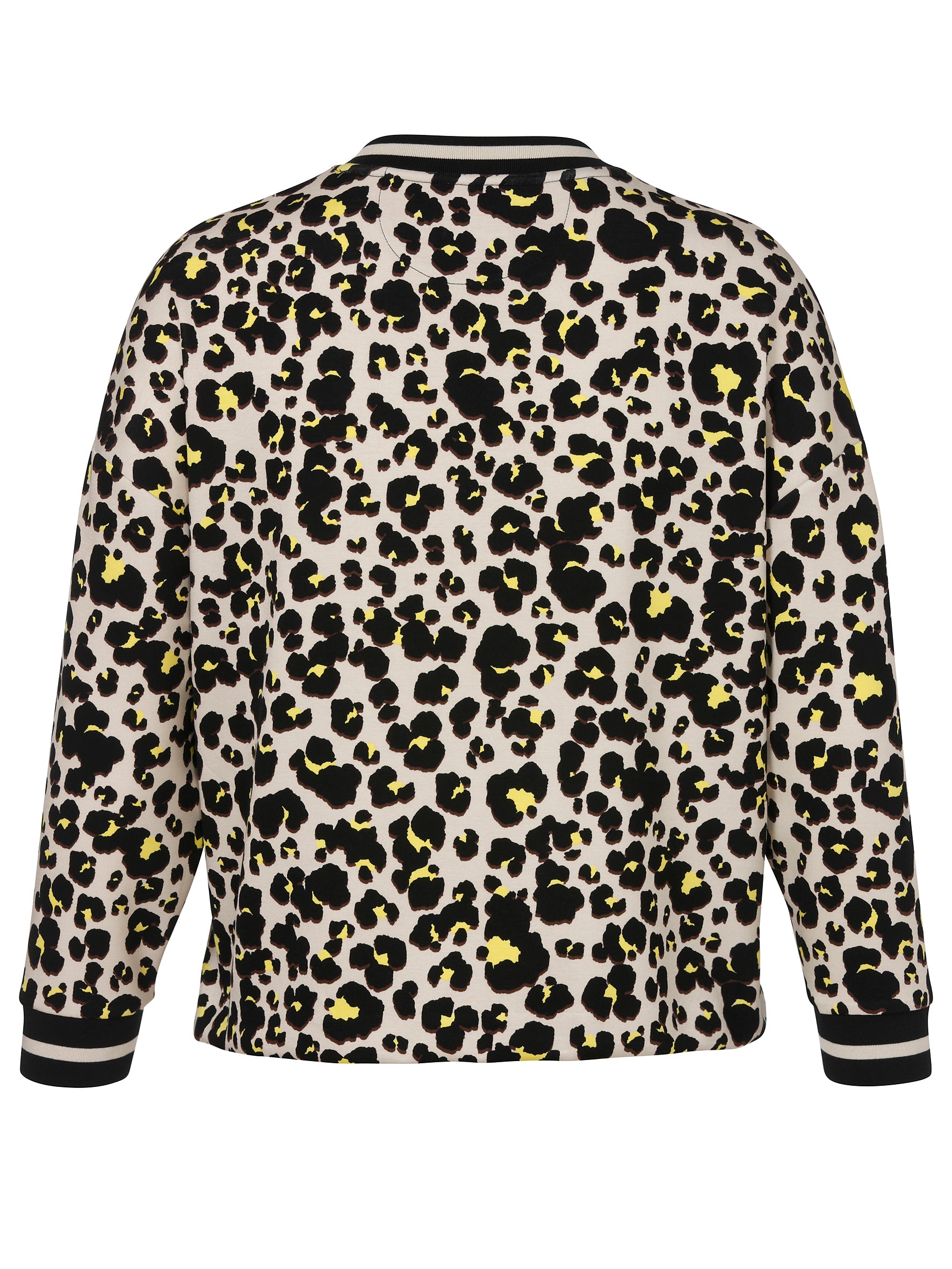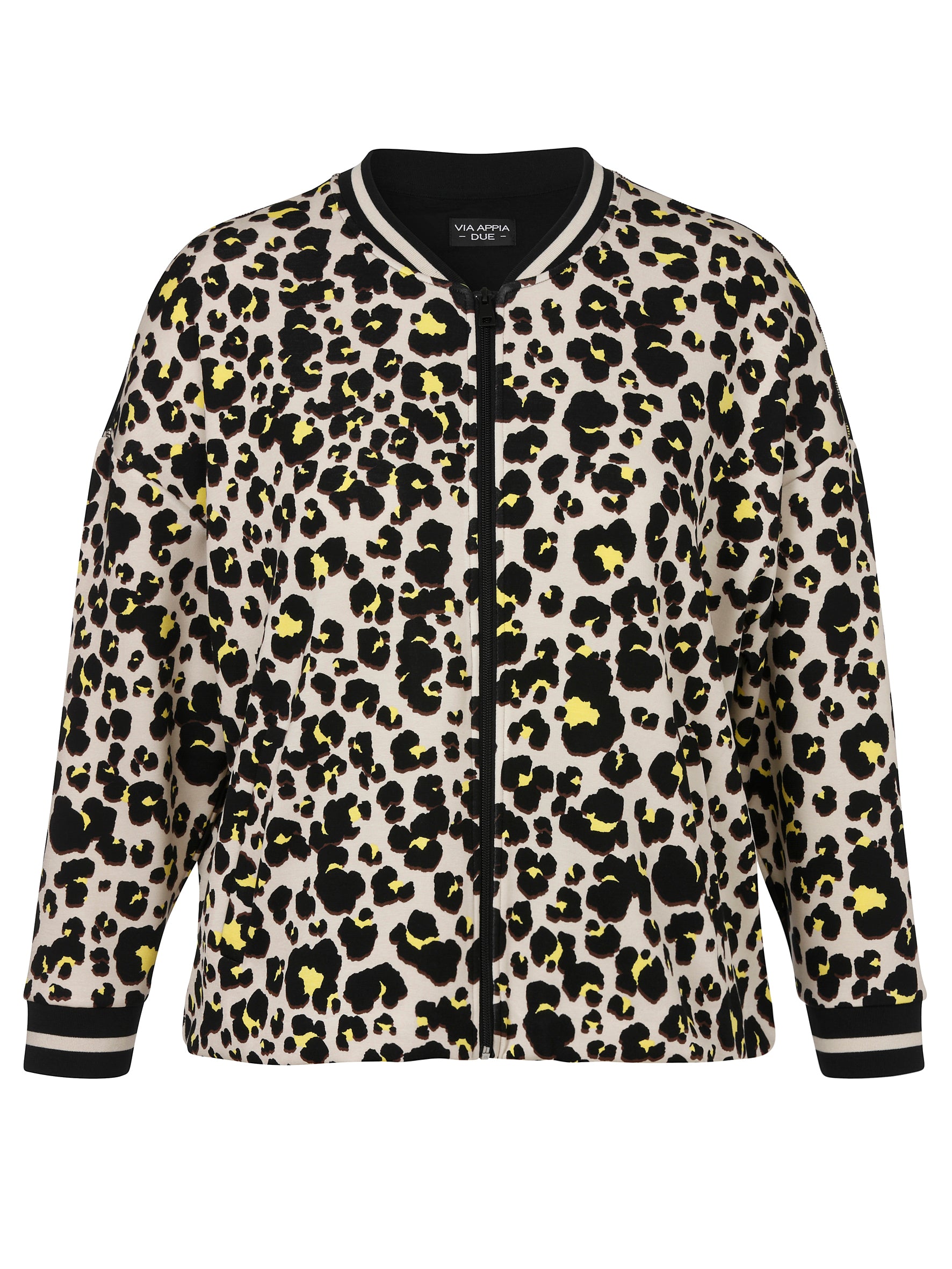 Dit casual jack van Via Appia Due is uitgevoerd met een all-over luipaard dessin in zwart, beige en geel. De jas heeft een sportieve V-hals en sluit met een zwarte ritssluiting. De lange mouwen en de halslijn zijn afgewerkt met zwart-wit gestreepte ribboorden, wat dit kledingstuk een bomberjack uitstraling geeft. De zoom van het damesjack is voorzien van een elastisch trekkoord met stoppers, waarmee je de pasvorm aan de onderkant kunt aanpassen.Pasvorm en Stijladvies