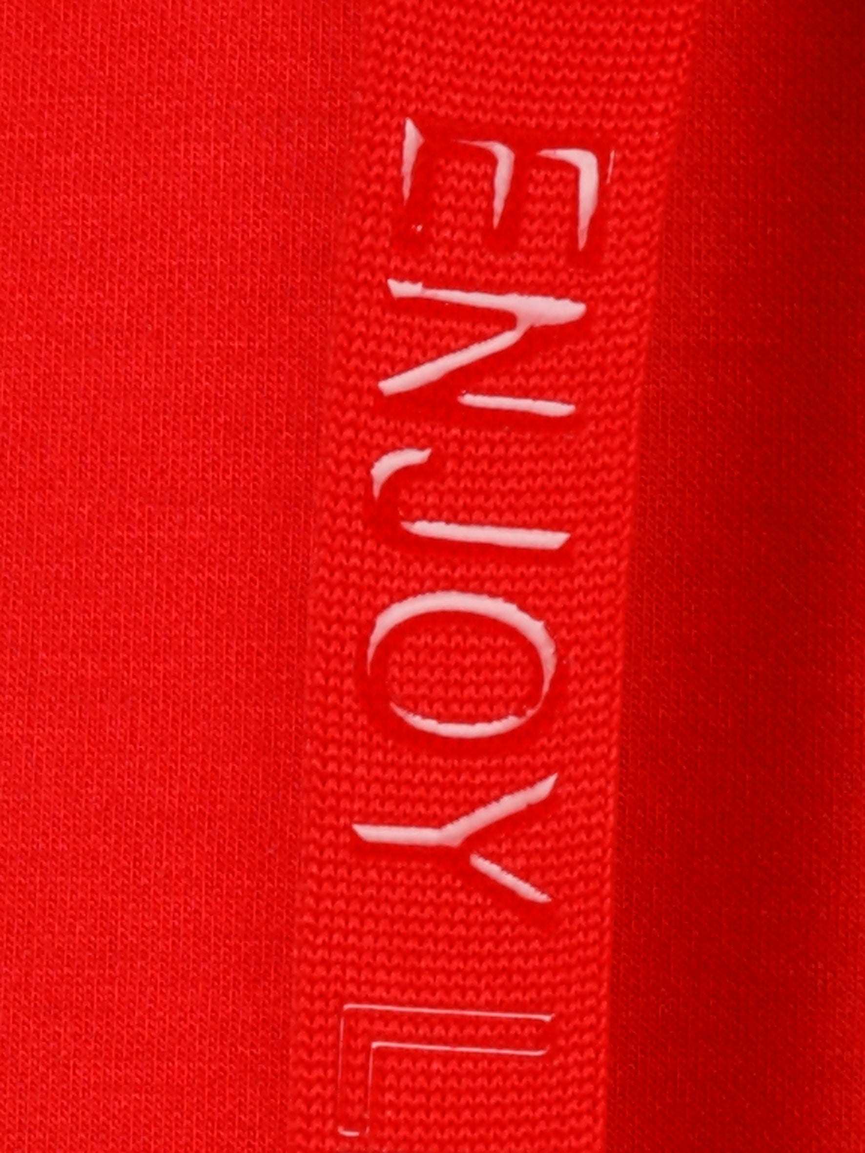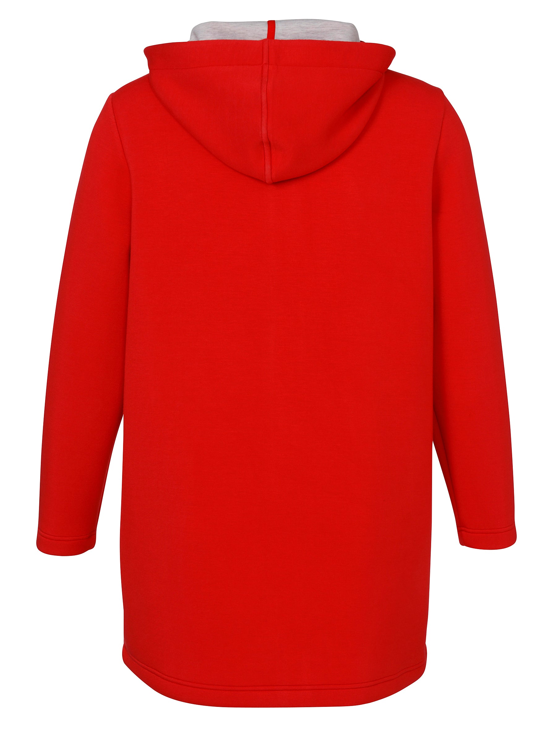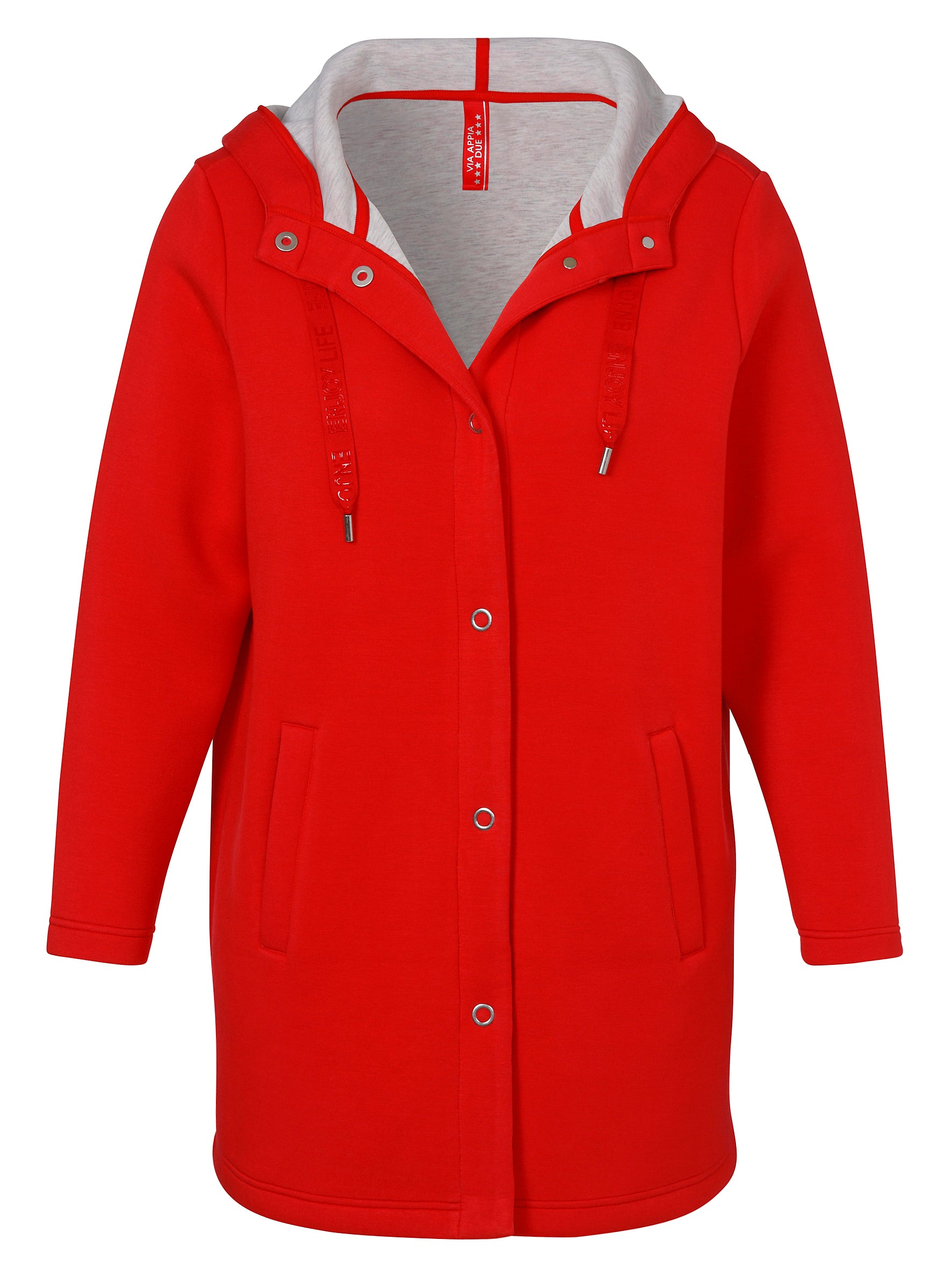 Dit rode sweat jack van Via Appia Due is ontworpen als een lange jas voor dames in grotere maten. Het jack met capuchon heeft een binnenvoering in een lichte, zilver gemêleerde kleur. De jas sluit met een reeks drukknopen over de volledige lengte en is voorzien van twee steekzakken aan de voorkant. Op de capuchon trekkoorden staat de witte print 'ENJOY' subtiel verwerkt.Pasvorm en Stijladvies
