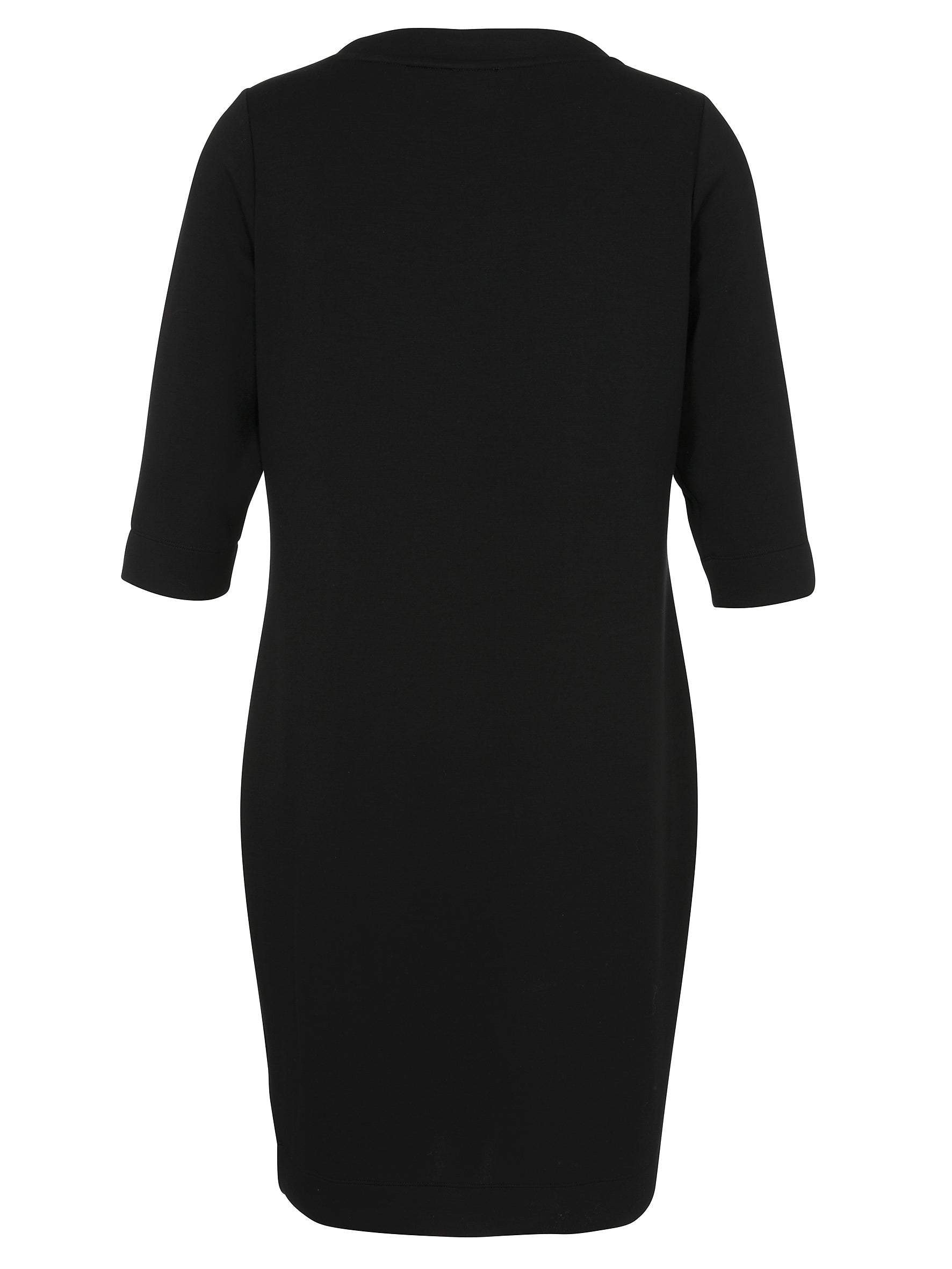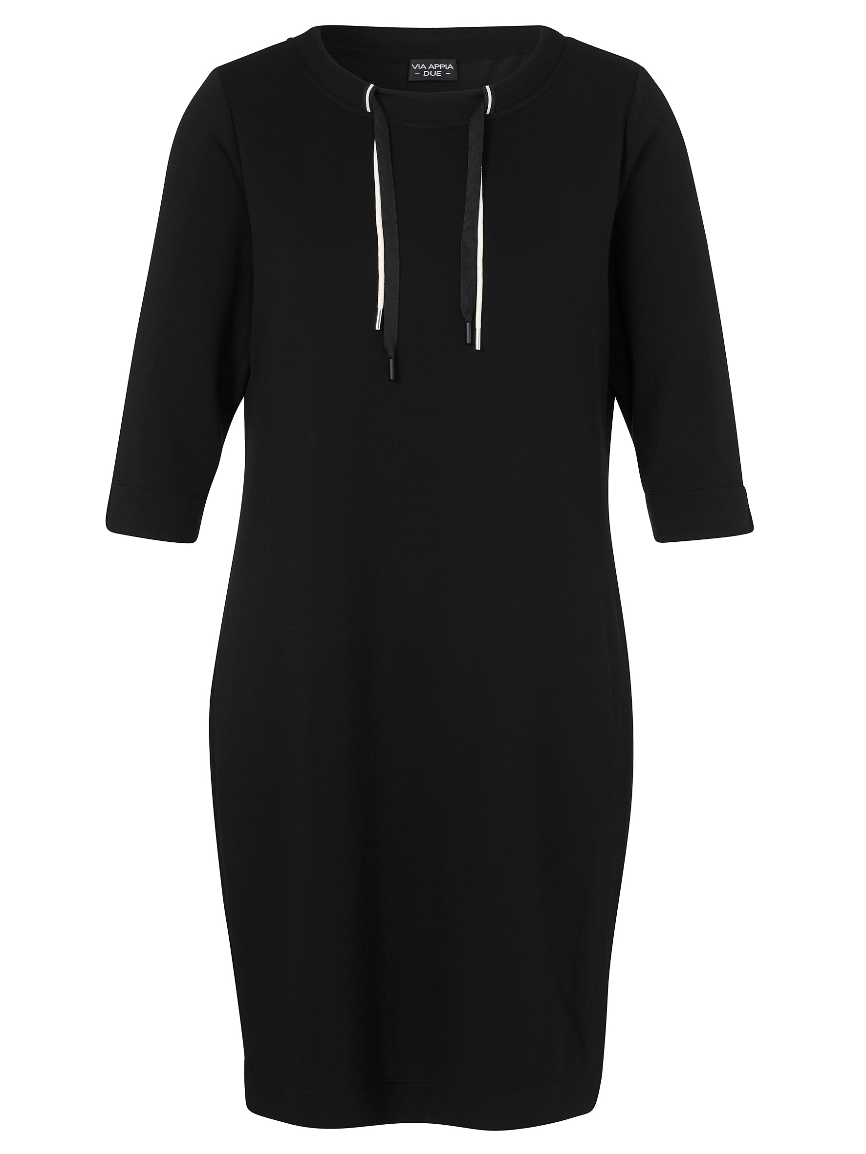 Deze casual jurk van Via Appia Due is uitgevoerd in zwart in een recht model. Het kledingstuk heeft driekwart mouwen en een ronde hals. Bij de hals bevinden zich decoratieve trekkoorden in vanille en zwart, afgewerkt met metalen tips. Dit moderne kledingstuk met korte mouwen is ideaal voor een relaxte uitstraling.