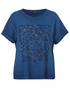 Dit Via Appia Due bovenstuk is een T-shirt in de kleur tinte multicolor. Het shirt heeft een klassieke, ronde hals en korte mouwen met een opgerolde boord. De voorkant is voorzien van een opvallend vierkant dessin van glanzende, donkerblauwe pailletten in een organisch patroon. Dit casual shirt van Via Appia Due heeft een rechte, losvallende pasvorm.