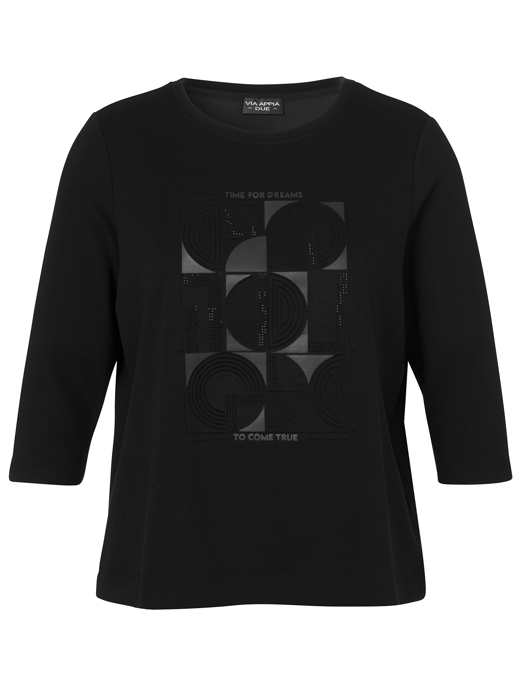 Deze Via Appia Due Trui 2621760 schwarz is uitgevoerd in een effen zwarte stof met een ronde halslijn. De dames trui heeft driekwarth mouwen en is op de voorzijde voorzien van een grafische ton-sur-ton print. Het dessin bestaat uit geometrische vlakken met daarin kleine steendetails. Boven en onder de print staan de woorden: "TIME FOR DREAMS" en "TO COME TRUE". Deze Via Appia Due sweater is een casual item voor dagelijks gebruik.Pasvorm en Stijladvies