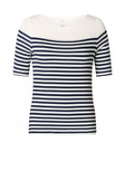 De Yest Curve Blouse A006118 is een donkerblauwe gestreepte top met een casual uitstraling. Dit shirt met korte mouwen heeft een maritiem dessin, bestaande uit horizontale strepen in donkerblauw en crèmewit. De aansluitende top is ontworpen met een wijde boothals. Het bovenste gedeelte van het voorpand is uitgevoerd in een effen witte kleur, wat zorgt voor een rustige afwerking. Dit moderne shirt is een toevoeging aan je garderobe.