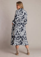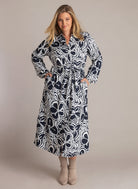 De Yest Curve A006243 lange jurk is uitgevoerd in een donkerblauwe basis met een wit, grafisch bloemenpatroon. Deze damesjurk is ontworpen als een doorknoopjurk en heeft een klassieke overhemdkraag. De jurk heeft lange mouwen met manchet en is voorzien van een bijpassende, strikbare ceintuur in de taille. De Yest Curve JURK LANG beschikt over twee steekzakken aan de zijkant en korte splitjes in de zoom, wat deze midi-jurk compleet maakt.Pasvorm en Stijladvies