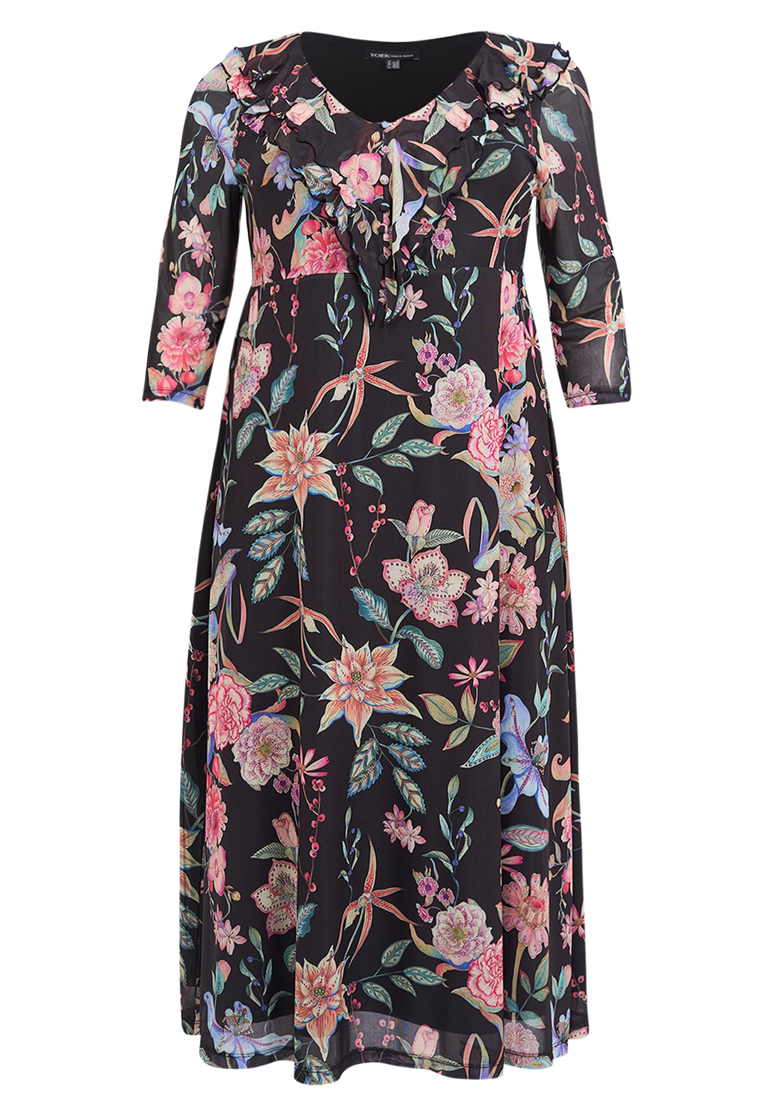 Deze A-lijn maxi-jurk van YOEK heeft een zwarte basis met een all-over bloemenprint in diverse kleuren. De V-hals is afgewerkt met ruches die doorlopen over de schouders. De damesjurk heeft driekwart mouwen en de hals kun je aanpassen met de twee smalle koordjes. Dit losvallende model valt tot over de kuit.