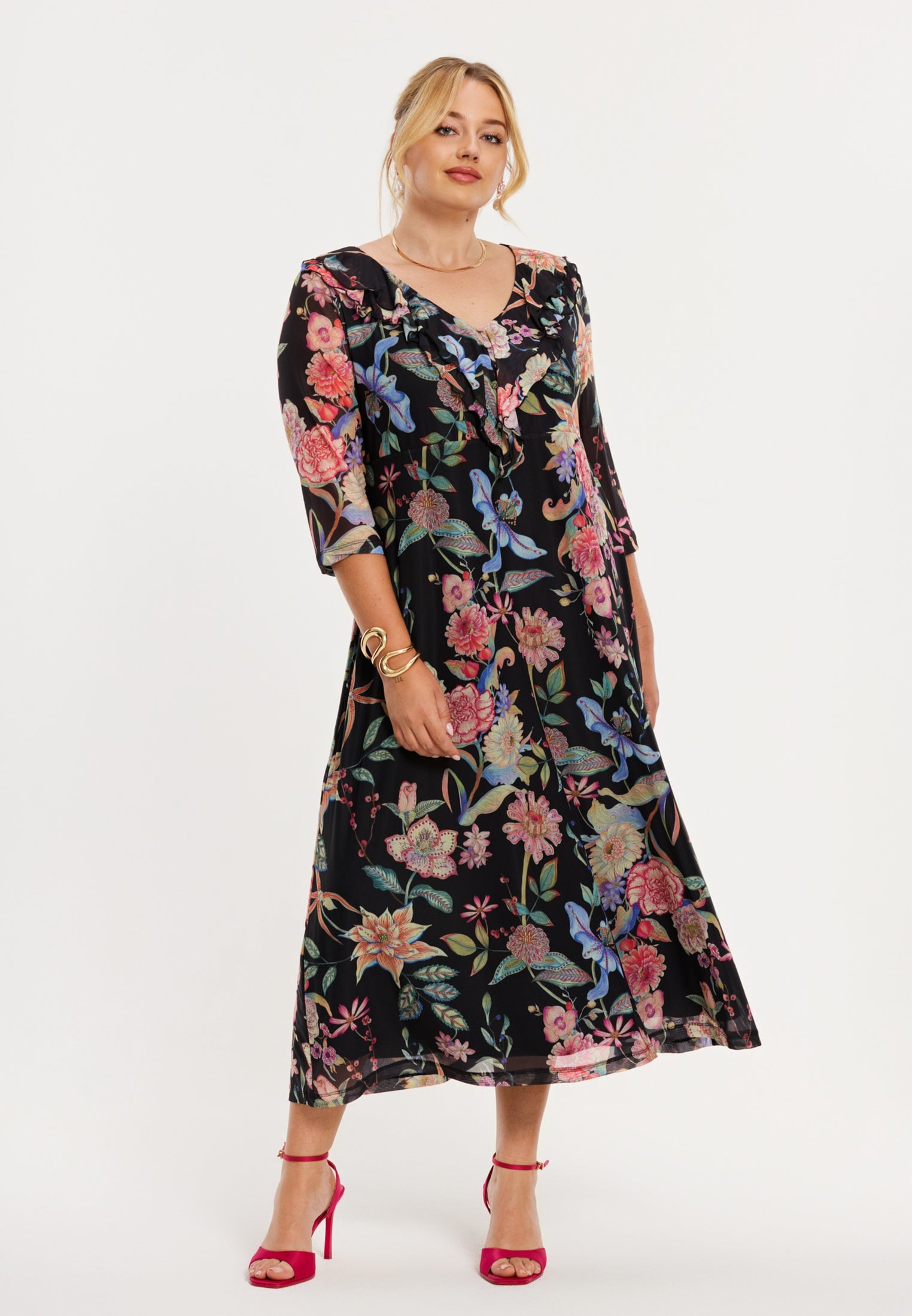 • Design - All-over bloemen dessin en ruches langs de halslijn