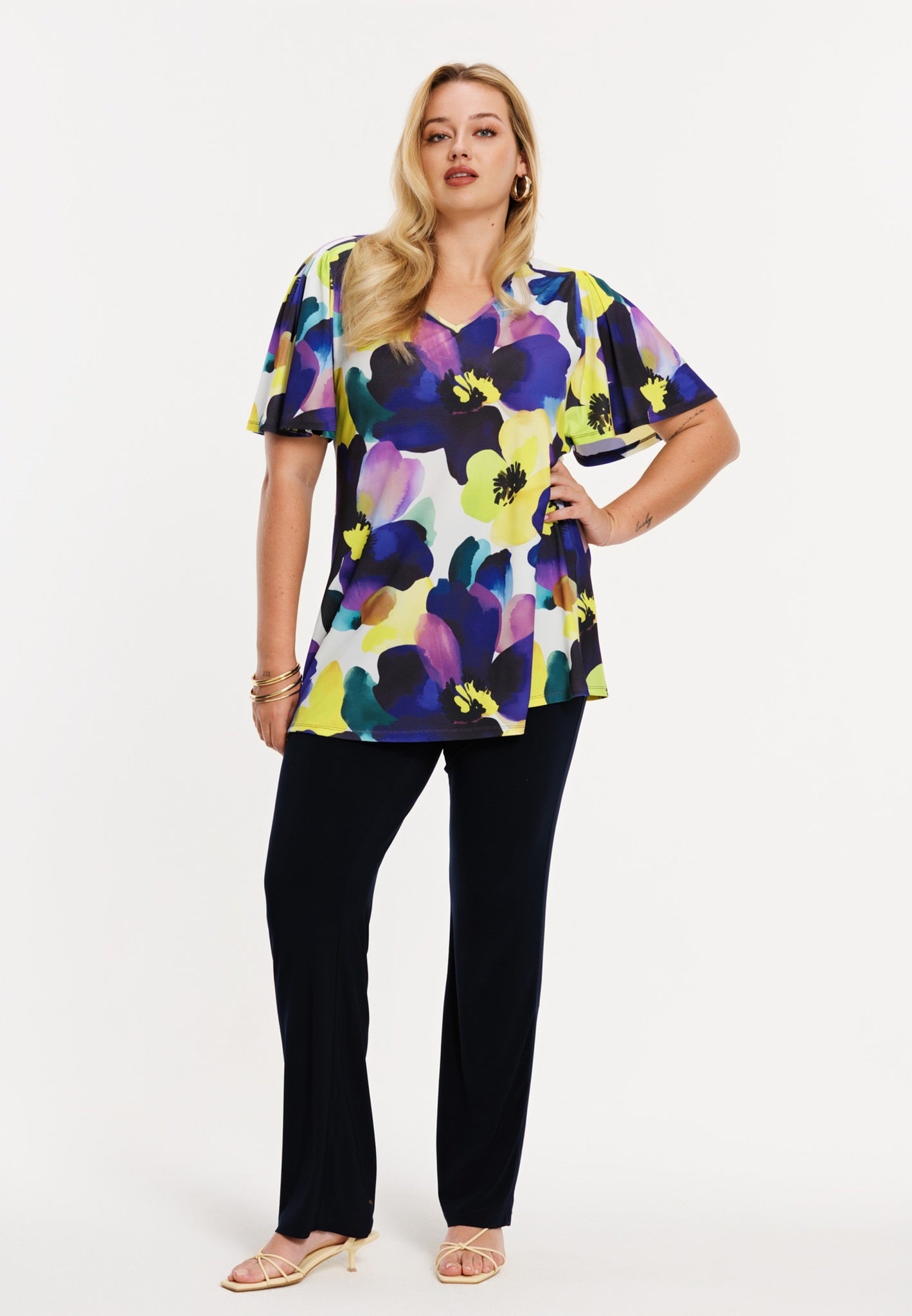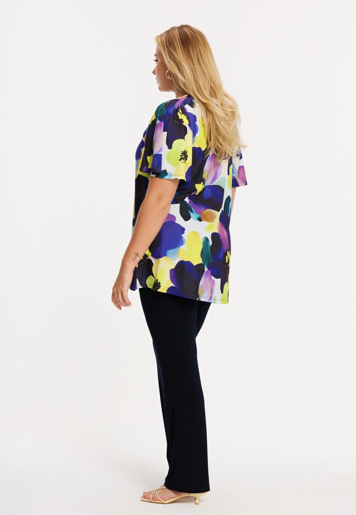 De YOEK tuniek met bloemendessin 362473 valt op door de levendige paarse, blauwe en gele kleurstelling. Dit casual bovenstuk, ontworpen voor een ruimere pasvorm, heeft een klassieke V-hals en korte, wijde mouwen. De veelkleurige bloemenprint maakt dit tuniek shirt een optimistische toevoeging aan je garderobe. Dit kledingstuk voor grote maten is ideaal voor een relaxte uitstraling.Pasvorm en Stijladvies