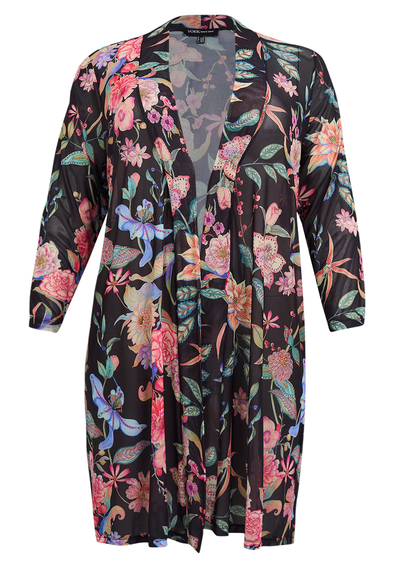 Dit langere dames vest van YOEK is uitgevoerd in een semi-transparante zwarte stof. Het item heeft een all-over bloemen dessin in verschillende kleuren, waaronder roze, blauw en groen. Dit gebloemde vest heeft lange mouwen en valt open aan de voorzijde, zonder sluiting. De halslijn is afgewerkt met een brede, doorlopende revers. Dit kimono-stijl vest is een makkelijk kledingstuk om je look een casual en opgewekte uitstraling te geven.Pasvorm en Stijladvies